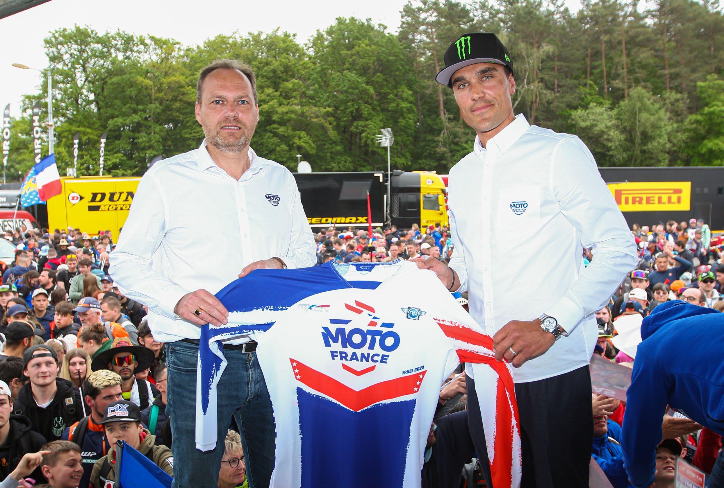 2 Exclusive Unveiling of the new 2023 MXoN Racing shirt of Team France by Legend and Team Frane Manager Gautier Paulin with the FFM President Sebastien Poirer during the Paddock Show in France with a incredible public. What a moment!