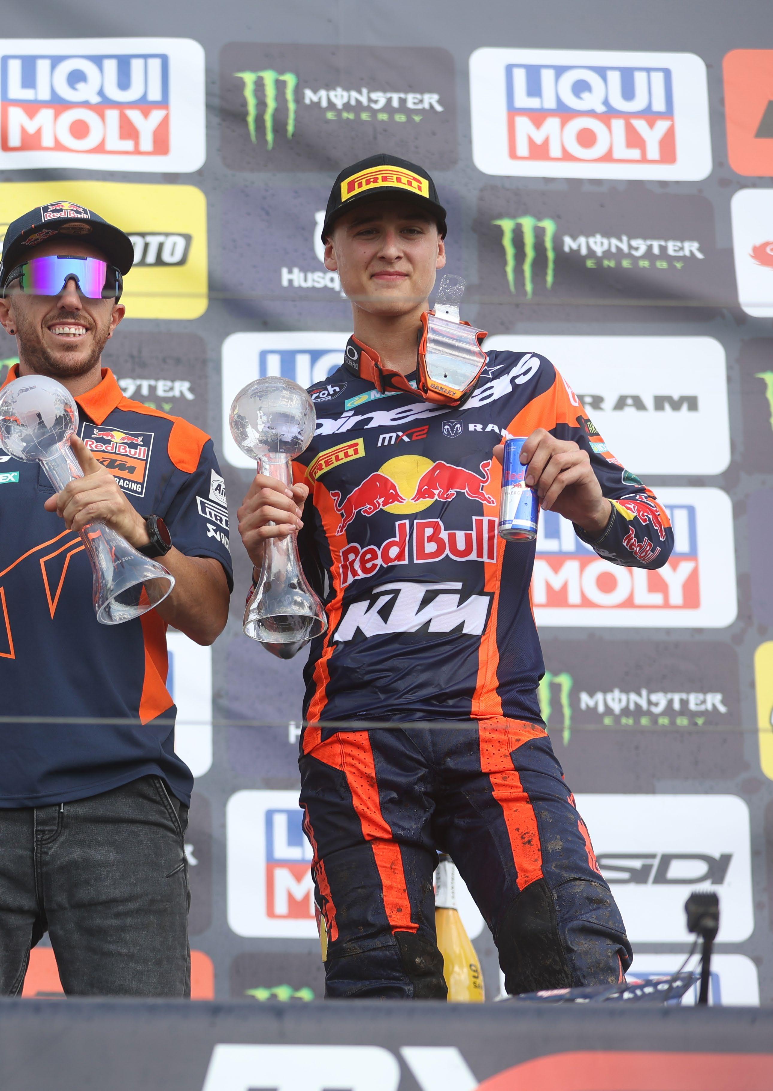 Since that opening round in Argentina, this young team has gone from strength to strength. Adamo came away with his second career podium, a 2nd overall thanks to a brace of 3rd place finishes. In Switzerland, round three, he placed 2nd again, and in Trentino, round four, the ‘80’ finally graced the top step of the podium to win his first grand prix with a consistent 2-2. Joining him on the podium that day was his teammate Liam Everts, who took 2nd overall with a 3-3. Four rounds in and the new kids on the block had brought home a 1-2 for KTM and the new team manager, Antonio Cairoli.