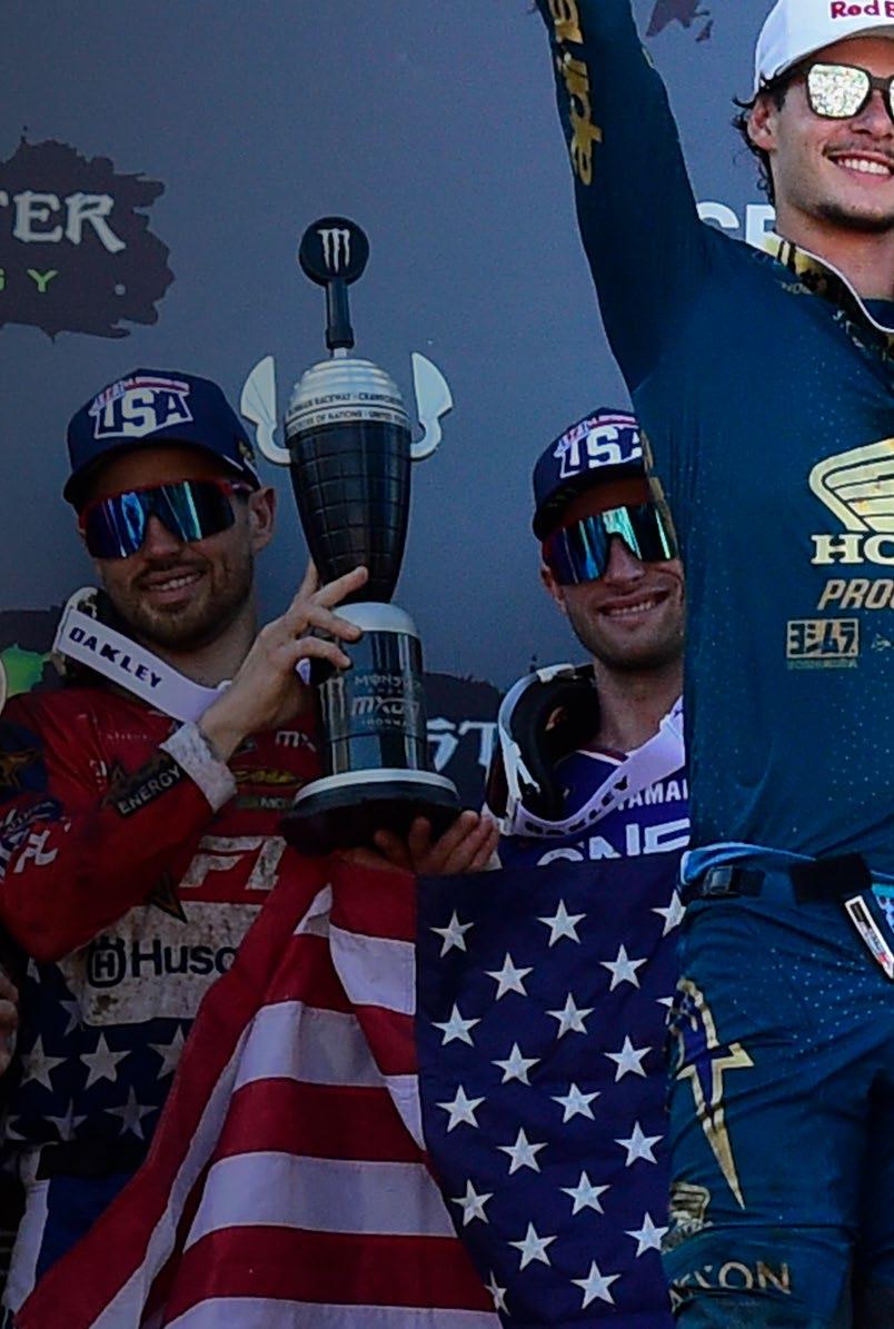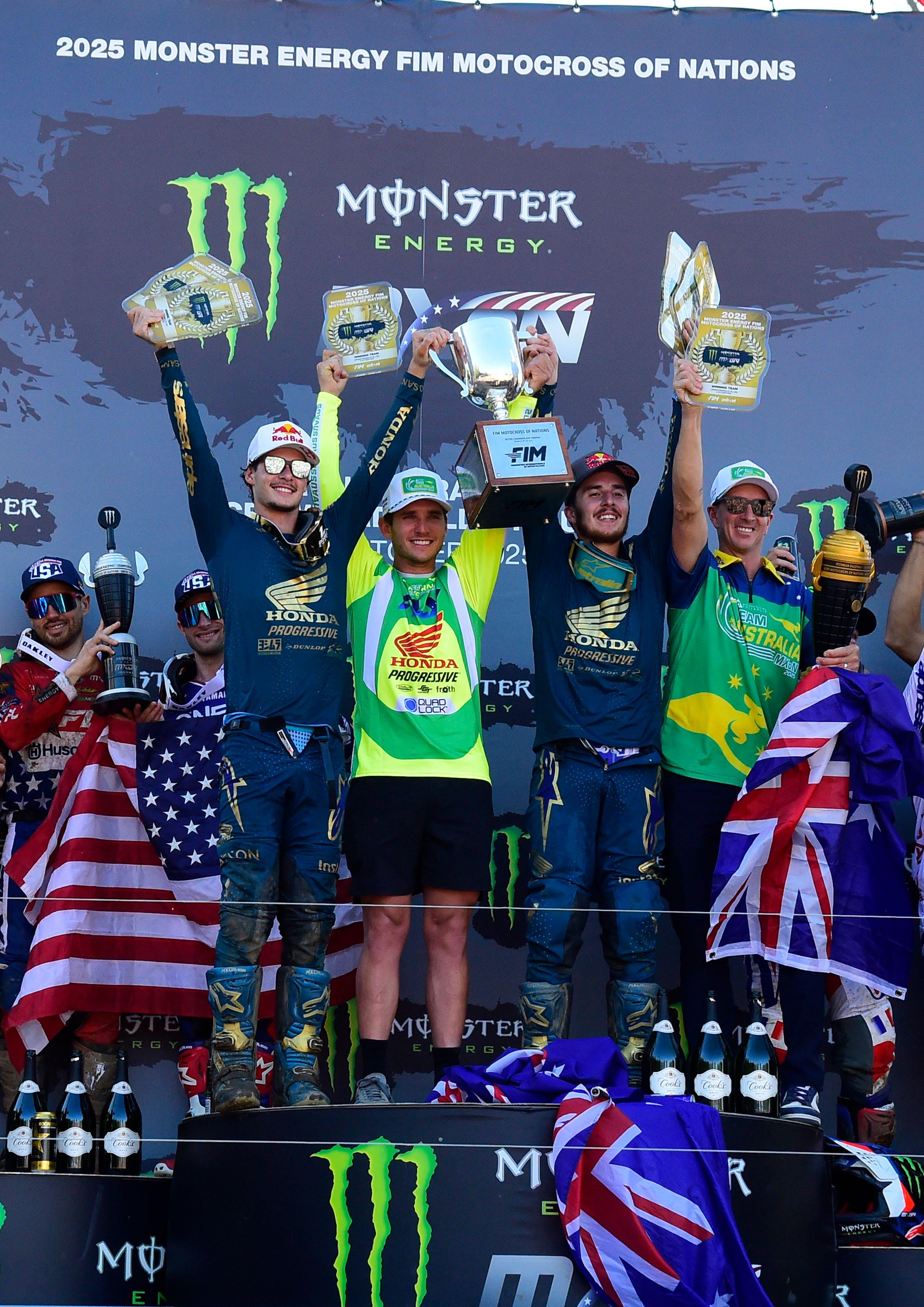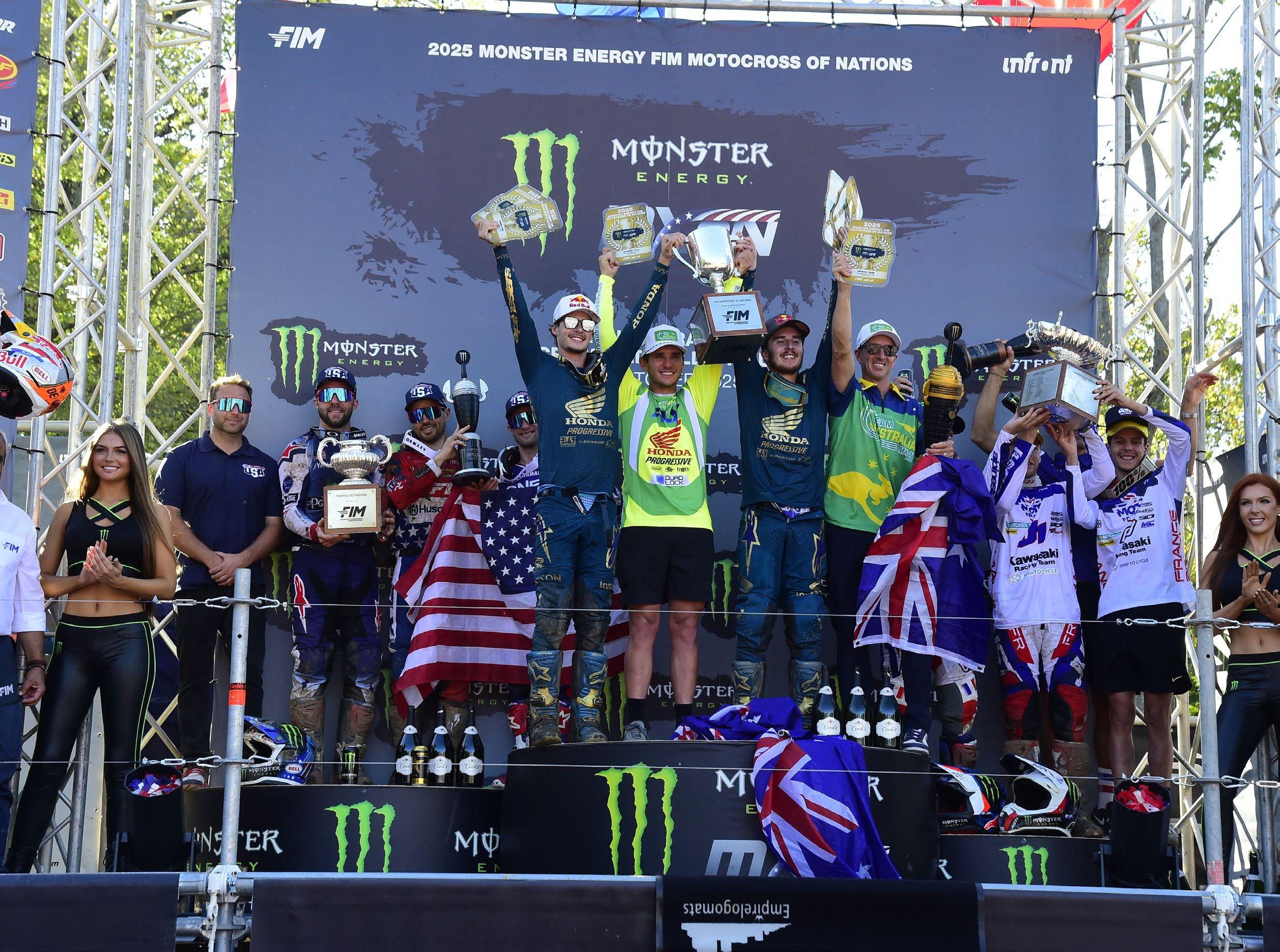 AUSTRALIA ARE WORLD CHAMPIONS AGAIN, AFTER A STUNNING DISPLAY OF RIDING FROM ITS TRIO OF RIDERS JETT LAWRENCE, HUNTER LAWRENCE AND KYLE WEBSTER, WHO LIFTED THE PETER CHAMBERLAIN TROPHY ON AMERICAN SOIL AT IRONMAN RACEWAY, INDIANA FOR THE SECOND SUCCESSIVE TIME, TO WIN THE 78TH EDITION OF THE MONSTER ENERGY FIM MOTOCROSS OF NATIONS. USA AND FRANCE ROUNDED OUT THE PODIUM ON WHAT WAS ANOTHER GREAT WEEKEND IN THE HISTORY OF THIS ICONIC EVENT.
