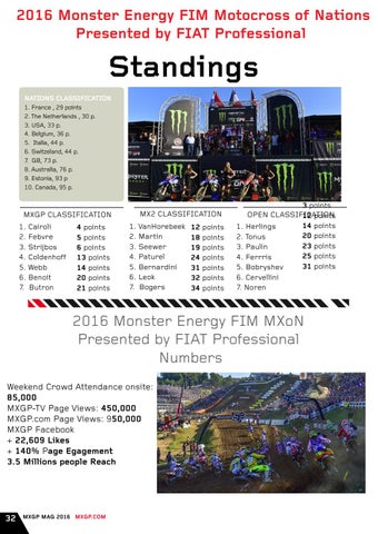 2016 Monster Energy FIM MXoN Presented by FIAT Professional Numbers Weekend Crowd Attendance onsite: 85,000 MXGP-TV Page Views: 450,000 MXGP.com Page Views: 950,000 MXGP Facebook + 22,609 Likes + 140% Page Egagement 3.5 Millions people Reach
