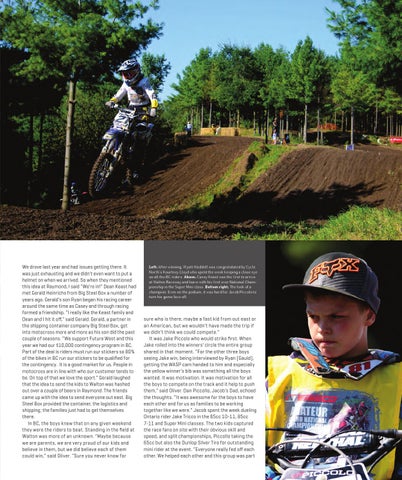 sure who is there, maybe a fast kid from out east or an American, but we wouldn’t have made the trip if we didn’t think we could compete.” It was Jake Piccolo who would strike first. When Jake rolled into the winners’ circle the entire group shared in that moment. “For the other three boys seeing Jake win, being interviewed by Ryan (Gauld), getting the WASP cam handed to him and especially the yellow winner’s bib was something all the boys wanted. It was motivation. It was motivation for all the boys to compete on the track and it help to push them,” said Oliver. Dan Piccollo, Jacob’s Dad, echoed the thoughts. “It was awesome for the boys to have each other and for us as families to be working together like we were.” Jacob spent the week dueling Ontario rider Jake Tricco in the 65cc 10-11, 85cc 7-11 and Super Mini classes. The two kids captured the race fans on site with their obvious skill and speed, and split championships, Piccollo taking the 65cc but also the Dunlop Silver Tire for outstanding mini rider at the event. “Everyone really fed off each other. We helped each other and this group was part