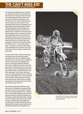 The Can’T Miss Kid WhaT ever happened To sTeve BulyovsKy? 1987 had been an incredible season; six Junior titles won. Check that one off the list. Six Senior titles won, check that off too. To top things off Steve had the cast on his ankle removed prematurely so that he could line up for his first Expert race at Copetown in the fall. In the span of a few months he had taken the big step from first year junior rider to Expert. The buzz surrounding Steve at this time was substantial. He was being tapped as the heir apparent to Ross Pederson. Yamaha Canada’s Motocross Team Manager at the time, Mark Stallybrass, offered a factory ride for the following season. John Mochrie from Royal City Cycle, a long-time supporter of Steve’s, stepped up his support and Don Valley North Toyota came on board as well hooking Steve up with a sweet new pick-up truck. On the surface things looked great. Steve admits however that he knew the jump up to full-time Expert racing was going to be a big one. The Yamaha deal was good for Canada at the time. “It was just bikes and parts though”, recalls Steve. Once again his father stepped in and equipped Steve with a brand new cube van and all the expense money he needed to complete his first Expert season. The Expert (now Pro) field in Canada was surprisingly deep during the late ‘80s. Steve lined up against consummate Pros like the Ross “Rollerball” Pederson, Doug Hoover, Al Dyck, Jeff Surwall and Carl Vaillancourt. This crew of wily veterans was complemented by a great core of ultra-fast young stars like Marty Burr, Chris Lemmon, Bill Wallin and at selected rounds Kevin Moore. While he realistically knew that he was in tough with this group, the ever-confident Bulyovsky felt that a top ten national number was definitely within his reach for his rookie season. So at the age of sixteen Steve struck out on what he believed at the time to be the first of many successful National tours. Things were different however and Steve noticed it right away. His support group, his family, wasn’t with him anymore. His father was busy with work and also had to travel the amateur circuit with his younger brother Rob. Steve ended up transporting Ross Pederson and his bikes around for the Nationals. Any thoughts that Ross may become a mentor to the young rider were quickly put to rest. “He was just along for the ride,” remembers Steve. In fact, after Ross punted Steve off the track one night at an arenacross in Quebec the relationship with his travelling companion deteriorated rapidly. “Basically, he went from being my hero and idol to a guy I wanted to strangle,” stated Bulyovsky. Steve battled hard in his rookie season but ended up just outside the top ten nationally. While most rookies would consider this to be a successful campaign Steve was disappointed.