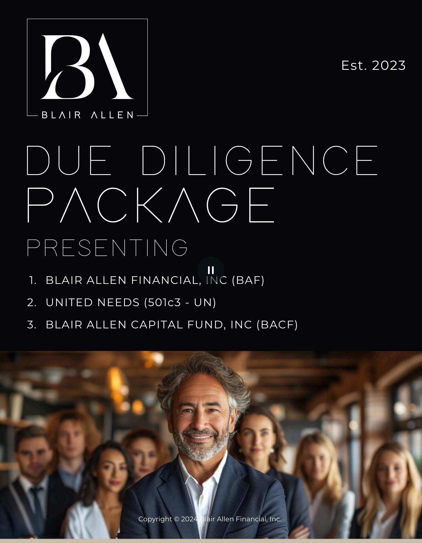 Investor & Lender Disclosure Statement- Blair Allen Financial, Inc (“BAF”) and its affiliated companies Blair Allen Luxury Real Estate, LLC (“BALR”), Blair Allen Property Management, LLC (“BAPM”), Blair Allen Mortgage, LLC (“BAM”), Blair Allen Insurance, LLC (“BAI”), Blair Allen Capital, LLC (“BAC”), and Blair Allen Technologies, LLC (“BAT”) collectively referred to as “the BAF Group,” are early-stage, privately held startup companies currently seeking investment and financing from accredited investors and private lenders to support the development and scaling of their respective operations