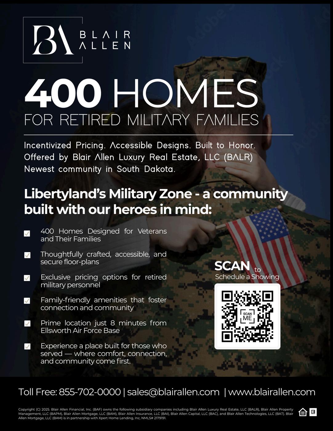 The development is only 8 minutes from Ellsworth Air Force Base which is expected to add 5,000 personnel and up to 20,000 residents due to the B-21 Raider rollout With no additional on-base housing planned Libertyland is positioned to capture significant residential demand