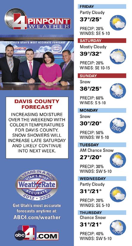 July 1, 2022 | Vol. 3 Iss. 26 $1.50 NEWS BREAK WashingtonParkcontractor...page3 CenterPoint’sBigSplash...page7 Thompsontoretire...page8 By Becky Ginos becky.g@davisjournal.com THUNDERBIRD F-16 planes fly in formation at the Warriors Over the Wasatch Air Show held over the weekend at Hill Air Force Base. Photo by Roger V. Tuttle DiamondTreeExperts.com 801-938-4345 Contact us today at Tree Trimming, Tree Removal, Stump Grinding, & More Arborist On Licensed Insured •Tree Maintenance •Stump•DemolitionRemoval •Landscape •Crane Work •24/7 Emergency Response Utah’s Leading Experts in Tree Services for Over 50 Years Now HiriNg! Year Round • FULL Benefits Bonuses • Overtime Paid Vacations • 401k • Growth Opportunities Call 801-262-1596 or email trent@diamondtreeexperts.com $35K up to $80K! SERving ALT kE, DAvi AnD WEbER COunT Treatment for bugs & disease Control weeds Improve soil Retain moisture Tree Services Plant &Tree Health Care Mulch Products present at estimate. combine offers. 7/31 present at estimate. combine offers. 7/31 present coupon estimate. Cannot combine offers. 10% OFF 10% OFF 10% OFF HILLAIR FORCE BASE–Gold medalist Olympians Justin Schoenefeld andAshley Caldwell are used to doing flips in the air – on snow – not in an F-16 Thunderbird flying high above the ground. The Olympic skiers were guests aboard the planes during a flight demonstration practice run Friday in preparation for the much anticipated Warriors Over the Wasatch Air show Saturday and Sunday at HillAir Force Base. “It was so insane,” said Caldwell when she was back on firm ground. “I didn’t know if I’d keep my food down. I can’t believe these guys do this all the time. It was tense.” “It was crazy,” said Schoenefeld. “It was like an elephant on your chest and your vision goes away for a minute. We were going 4G’s and I thought that was crazy then we went faster and I thought ‘oh gee.’” It was a real treat, said Lt. Col. RyanYingling. “It was unique and fun for us and fun for you guys. It was a blast. We got through everything and went into super sonic airspace and broke the sound barrier.” They started training on the F-16 early this morning, said Jake Impellizzeri, Thunderbird eight. “It was information by firehose. I putAshley through the wringer. We pulled 9G’s and 1.28 Mach. We did loops and rolls and she got some stick time. It was an honor.”What they do in the Olympics showcases a beacon of excellence, he said. “It’s doing something greater than ourselves.That’s what they represent. It's an inspiration to our team that’s what we try to achieve in the Air Force.” Caldwell said she’s trained her whole life to reach the Gold medal standard. “TheAir Force sets a high bar. I give a high performance in skiing and these guys give a high performance in a different way. It’s two different worlds.” An aerial doesn’t get any less scary, said Schoenefeld. “When I do a triple backflip I’m nervous every day. When we took off I thought ‘oh we’re about to go fast.’” It was absolutely incredible, said Caldwell. “My Gold medal went through the speed of sound. This was the highlight of my post Olympic experience. It was a dream come true and now it’s off my bucket list.” It’s hard to describe the indescribable, she said. “It’s like if a dragon and a unicorn had a baby strapped to a rocket ship. I’m so excited to be a part of this and I’m grateful for their service.” l Gold medalists break the sound barrier aboard Thunderbirds This year’s primary elections in Davis County were completely between candidates in the Republican Party, which has dominated the county’s political offices for years.As of early Wednesday morning, here were the vote totals in Davis County for candidates in a number of races: U.S. Senate As expected, incumbent Mike Lee fought off the challenges of two Davis County residents, Becky Edwards of Bountiful andAlly Isom of Kaysville. Lee garnered 24,859 votes to 16,045 for Edwards and 4,517 for Isom in Davis County. Lee took 60 percent of the votes statewide. U.S. House District 1 Incumbent Blake Moore, seeking a second term of office, defeatedAndrew Badger and Tina Cannon in this primary, getting 14,769 votes. Badger was second at 6,712 and Cannon third at 3,363. U.S. House District 2 Incumbent Chris Stewart moved into November’s general election with a win over challenger Erin Rider. Stewart finished with 13,781 votes to 6,329 for Rider. State Senate District 6 Jerry Stevenson advanced into NovemIncumbents dominate in Davis GOP Primaries By Tom Haraldsen tom.h@davisjournal.com Please see ELECTIONS pg. 2 Wayment earns spot on U.S. National Team Courtney Wayment, the Davis High and recently graduated BYU distance runner, finished second in the 3000-meter steeplechase at the USA Outdoor Track and Field Championships to win a spot on the U.S. world championship team. After her collegiate-record performance in the NCAA championships two weeks ago, Wayment knocked another four seconds off her record performance in the NCAA meet –which was eight seconds faster than any collegian has ever run – finishing with a time of 9:12.10. The world championships will be held on this same track at the University of Oregon in three weeks. Judge issues temporary restraining order on Utah’s abortion trigger law Physicians in Utah may continue to provide abortions for patients until at least July 11. On Monday, Third District Court Judge Andrew Stone granted a request from Utah’s Planned Parenthood Association for a 14 day TRO. He said he felt allowing the law to take immediate effect could cause “irreparable harm. Doctors here are threatened with felonies. The affected women are deprived of safe, local medical treatments to terminate pregnancies.” Doctors can continue to provide abortions in the Beehive State for the next two weeks, a state judge decided Monday. Stone granted the order at the reques