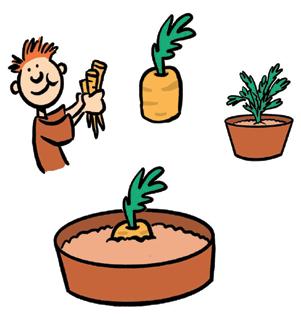 Next time you eat a carrot, cut off the top and use it to start a plant. Use several carrot tops and you can start a garden.