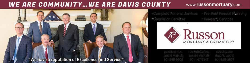 FOR ALL YOUR CEMETERY NEEDS Serving davis County For Over 60 Years Five generations in the monument business with unmatched craftsmanship, quality and service. Buy direct from us and avoid paying sales commission to a mortuary or salesman Like us on Facebook BOUNTIFUL MONUMENT 2010 SOUTH MAIN • BOUNTIFUL 801.295.2751 bountifulmemorialart.com OBITUARY You may choose a burial plot, urn garden, scattering gardens, columbarium niche, or memory wall at our on-site crematory. Whether your family would like a direct cremation without a ceremony or would like to enlist the help of our funeral planners for a memorial ceremony, we are here to help. Choose traditional funeral services or life celebrations to honor the life of your loved one. As you plan the end-of-life services, there are dozens of decisions to make during an emotional time. LET OUR TEAM HELP YOU choose urns, vaults, and memorials. We can also help with flower arrangements, catering, and grief resources. You can count on a variety of options for cremation services when you choose Larkin Mortuary. Cremation Services LarkinMortuary.com Larkin Mortuary 260 East South Temple Salt Lake City, UT 84111 (801) 363-5781 Larkin Sunset Gardens 1950 East Dimple Dell Road (10600 S.) • Sandy, UT 84092 (801) 571-2771 Larkin Sunset Lawn 2350 East 1300 South Salt Lake City, UT 84108 (801) 582-1582 Larkin Mortuary Riverton 3688 West 12600 South Riverton, UT 84065 (801) 254-4850 LOCAL FAMILY OWNED & OPERATED Taking Care of your Family’s Needs every step of the way WE CAN ARRANGE ACCOMMODATIONS FOR MILITARY HONORS & VETERAN SERVICES IN ANY TYPE OF PROGRAM Emergency Water Storage Made Simple 385-393-1566 UTAHWATERVAULT.COM BLUE 160 GALLON WATER STORAGE TANK retail $699 $ 449 MADE IN UTAH – Support Local! NOW ONLY 35% OFF 160 Gallons Dimensions: 29”x36”x45” Large Cap For Easy Filling Stackable to Save Space FDA Food Grade Materials BPA FREE VEHICLES WANTED We’ll buy your running & non-running, wrecked or broken car, truck or van. (801) 506-6098 CarSoldForCash.com A Local Utah Company PROFESSIONALS Value BOOKS AND MORE www.letsreadfunbooks.com Educational, interactive and fun From activity books, to neat fiction series, to internet-linked science and history encyclopedias Buy Books and More NOW Contact Independent Consultant: Lauren Casper @ letsreadfunbooks.com FENCE REPAIR Jack’s Fence Repair Most Fences are Repairable! 20 years experience - licensed and insured SENIOR DISCOUNTS Call or text Jack 801-865-6382