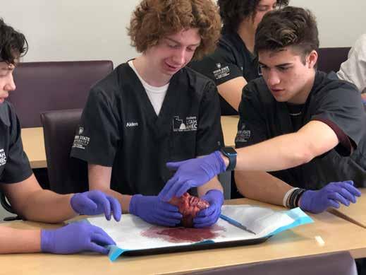 HIGH SCHOOL STUDENTS in the HTHA 2910 course at Weber State University Davis Campus an animal heart. The class offers hands-on experience in the health care field.