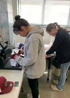 The class divides up the product line process into various teams, focusing on aspects of Supply Chain, Finance, Design, Sales, Marketing, Production, and Customer Service. Considering that the class at present is composed of five students, multiple hats are not just something they produce, but an organizational model. During the afternoon, the students move around the room working on a range of concurrent issues in various stages of completion. Alex Owens works on setting up the new tumbler etching rotary machine, while Jody Carpenter researches the machine specs online, Aleaha Medina works on assembling an order of hats with adhesive metal logos and Gentrie Carpenter checks the designs. As the hour progresses, they all move throughout the room assisting one another with different parts of the process. Lorrin Tingey, the other student in the class, was unavailable on Monday, but it was mentioned more than once that she would be consulted later on different topics.