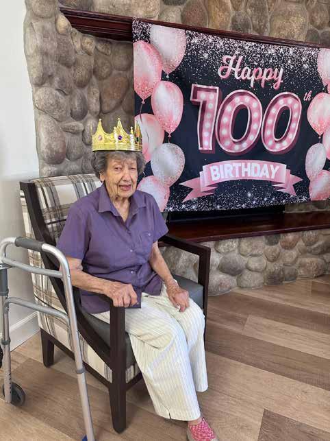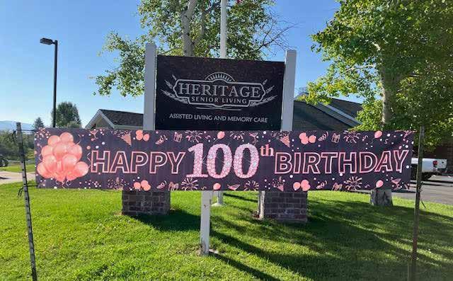 A banner outside Heritage Senior Living announces Helen's triple digit birthday.