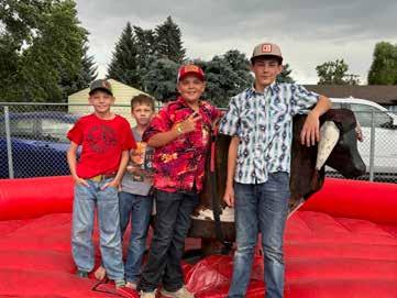 Cy Lusk, Waylon Lusk, Kase Thompson, and Hal Lusk stand with Thompson's mechanical bull, which will be open during the Fair.