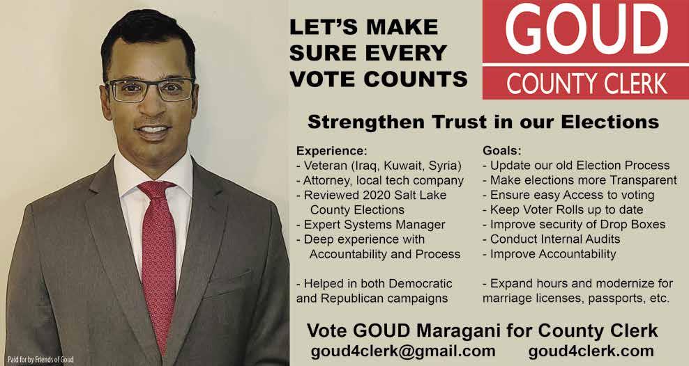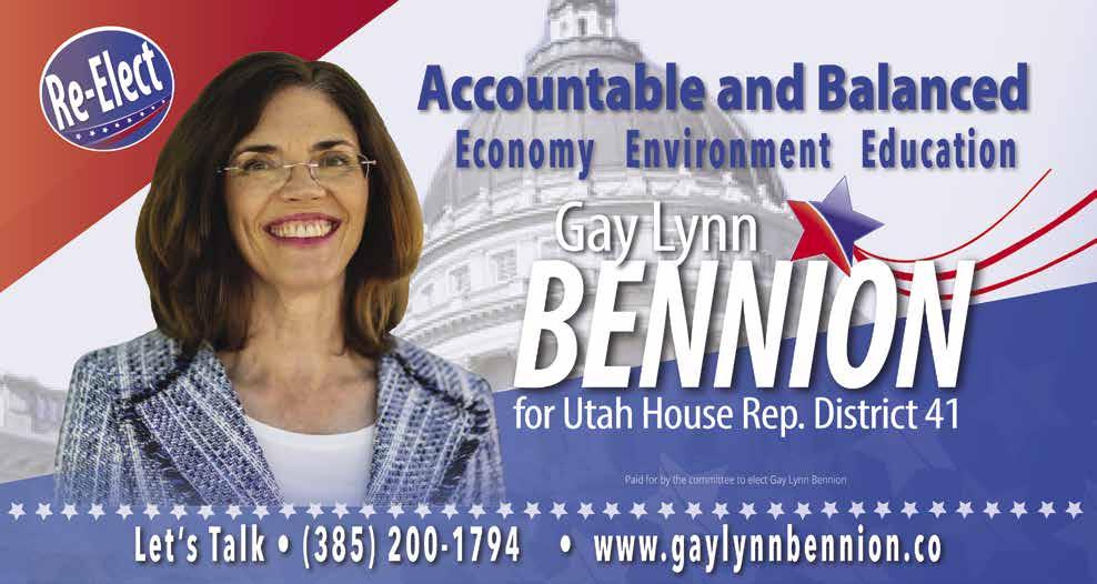 DIMENSIONAL SHINGLES WOODEN SHAKE SPANISH TILE New orders only. Does not include material costs. Cannot be combined with any other offer. Minimum purchase required. Other restrictions may apply. This is an advertisement placed on behalf of Erie Construction Mid-West, Inc (“Erie”). Offer terms and conditions may apply and the offer may not available in your area. If you call the number provided, you consent to being contacted by telephone, SMS text message, email, pre-recorded messages by Erie or its affiliates and service providers using automated technologies notwithstanding if you are on a DO NOT CALL list or register. Please review our Privacy Policy and Terms of Use on homeservicescompliance.com. All rights reserved. License numbers available at eriemetalroofs.com/licenses/. LIMITED TIME OFFER TAKE AN ADDITIONAL 10 % off 60 % off YOUR INSTALLATION Install for Military, Health Workers and First Responders + Warranty- Limited Lifetime. Transferable to 1 subsequent owner from original purchaser. Terms and conditions apply. Hail up to 2.5” Appearance of the surface coating beyond normal wear and tear. Limited time offer. Expires 10.31.22 Call today to schedule your FR EE EST IMATE 80 1 -895 - 423 8 getametalroof.com/newroof Made in the USA LESS POLITICS, MORE RESULTS DAVID MUIR FOR SALT LAKE COUNTY AUDITOR “A man about numbers and not politics. One of the few people in the State of Utah with the necessary data experience. He will focus on doing the right job, not a political job.” ENDORSED BY LOCAL GOVERNMENT LEADERS • Scott Howell, former Utah State Senator • Mike Weichers, Cottonwood Heights Mayor • Kelvyn Cullimore, former Cottonwood Heights Mayor • David Sanderson, consultant finance director • Lisa Dudley, former Riverton Finance Director, former CFO Unified Police Department of Greater Salt Lake • Dan Snarr, former Murray City Mayor EXPERIENCE • 26 years local government experience • MBA, Certified Internal Auditor, Certified Government Finance Manager • Awarded “Excellence in Financial Reporting” by the GFOA 2012-2022 WWW.DAVIDMUIR4AUDITOR.COM 801-580-6750 Paid for by David Muir INDEPENDENCE • Conclusions supported by evidence, not partisan-ideology • Seeking the truth with courage, confidence and integrity