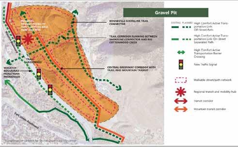 Gondola B would include a base station with 2,500 parking spaces near the mouth of Little Cot tonwood Canyon. Each gondola cabin would hold up to 35 people and depart every two minutes. (Gondola A was a suggested solution but was ulti mately decided against because of too many trans fers and stops increasing travel time in the canyon.)
