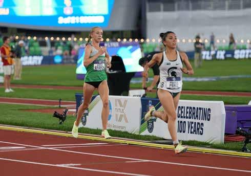 Former Corner Canyon High runner Hannah Branch (left) placed 17th in the 10,000 meters at the NCAA Championships June 9 in Eugene, Oregon, competing for Utah Valley University. In 2021, the senior was competing in the 5,000 and 10,000 events, but a broken foot during the 10,000 meter race, left her side lined. The Draper native bounced back after a two-month recovery to help the Wolverines cross country team win the Western Athletic Conference title last fall. This summer, she became the first UVU female runner to qualify for nationals. (Photo courtesy Clint Burgi, UVU)