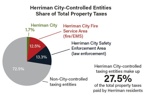 The city council manages three of these entities: Herriman City, which funds various city services and accounts for 1.7% of tax bills; the Herriman City Safety Enforcement Area, which funds the police and accounts for 13.3%; and the Herriman City Fire Service Area, which funds emergency medical and fire services and accounts for