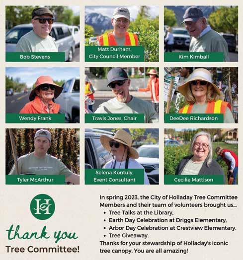 kids, dogs, and thrill-seeking kayaker friends well away from the banks of Big Cottonwood Creek. The speed and power of the creek is beautiful but treacherous. Keep your distance. Tragedy can evolve very quickly. If fl ooding is occurring today in Holladay or in our nearby sister cities, find a way to help. Whether through your church group or service club, step upyour neighbors may be in need. Don’t be shy. Push through that feeling of “they will be alright,” to “what can I do to help.” Donate those clothes you rarely wear. If the Red Cross has set up shop, offer your spare empty nested rooms to a neighbor in need. Hopefully, our preparations have been adequate, but if Mother Nature is humbling us, let’s respond with generosity and caring. After all, we’re from Holladay. Who is luckier than us?
