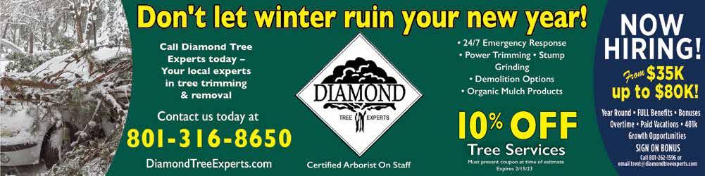 ROOFING 801-272-7000 All types of roofs $650 OFF any reroof over 2,000 sq. ft. VEHICLES WANTED We’ll buy your running & non-running, wrecked or broken car, truck or van. (801) 506-6098 CarSoldForCash.com A Local Utah Company PAINTING FULL SERVICE PROFESSIONAL PAINTING Interior/Exterior Residential/Commercial Over 20 Years Experience LICENSED AND INSURED For Immediate Service Call 801-865-4049 HOME IMPROVEMENT Katie Sheen Painter Excellent Paint Jobs - Affordable Prices Interior/Exterior . Residential/Commercial LICENSED AND INSURED Call Katie 385.628.7514 FREE ESTIMATES! NO JOB TOO SMALL! PROFESSIONALS Value PLACE AN AD: Call 801-254-5974 METAL EXTERIORS ASPEN ROOFING Specializing in metal roofs, wall panels, and exterior window treatments. 801-882-2332 www.aspen-roofing.com Call for a FREE estimate today TREE SERVICES INTERMOUNTAIN TREE EXPERTS Removals . Trimming . Pruning Licensed and Insured / 30+ Yrs Experience 801-244-3542 FREE ESTIMATES WATER SOFTENER RELIABLE SOFT WATER without the typical water softener problems • Zero maintenance • No breakdowns • 2/3 LESS salt For free in-home estimate: visit www.KineticoUtah.com or call 801-890-5344 HEATING & AIR CONDITIONING Apex Clean Air Installations & Repairs Call today for a free in home estimate. 801-449-1939 LEAFGUARD RAIN GUTTERS Guaranteed not to clog for as long as you own your home. If it clogs, LeafGuard will come out and clean it for you. One-Piece System, Professional Installation CALL AND RECEIVE A $200 VISA GIFT CARD WITH YOUR LEAFGUARD PURCHASE! Free Estimate - 385-300-0869 CONCRETE T3 Concrete LLC Specializes in Driveways, Walkways, Patios, Foundations, Retaining Walls, Basement Entrances Stamp & Color Concrete Call Mate’ for a FREE Estimate 801-918-8843 CONCRETE WE SPECIALIZE IN CONCRETE. Concrete Installation & Removal | Flatwork Patios Walkways Driveways RV Pads Stamp & Color Garages Retaining Walls Call Ala for Estimate 801-835-0051 AnEConstructionLLC@gmail.com SIDING Capitol Exteriors Siding – Soffit – Fascia –Raingutters Call NOW For SPECIALS (801) 253-2566 FITNESS Strength Training for all levels and ages 30 Minute Workouts • In person and at home • Friendly, fun community Call today for a FREE guided workout (801) 942-3664 FENCE REPAIR Jack’s Fence Repair Most Fences are Repairable! 20 years experience - licensed and insured SENIOR DISCOUNTS Call or text Jack 801-865-6382 TOOL & MACHINERY SALES & REPAIR M&M Power Tools • Woodworking Parts and Accessories Warranty and Repair Services GUARANTEED mmtoolparts.com 801-484-8200 3362 South Main Street PERMANENT LIGHTING Trimlight Permanent Lighting Waterproof, programable energy efficient Lifetime Warranty of all Parts Call now to get discounted pricing for installation after the holidays 801-890-3418 BOOKS AND MORE www.letsreadfunbooks.com Educational, interactive and fun From activity books, to neat fiction series, to internet-linked science and history encyclopedias Buy Books and More NOW Contact Independent Consultant: Lauren Casper @ letsreadfunbooks.com HEATING & AIR CONDITIONING SERVICE & REPAIR LOCALLY OWNED AND OPERATED Residential and Light Commercial Call Jeff at 801-347-1150 24 Hour Emergency: 801-484-0506 SUGARHOUSE HEATING & AIR HEATING & AIR CONDITIONING
