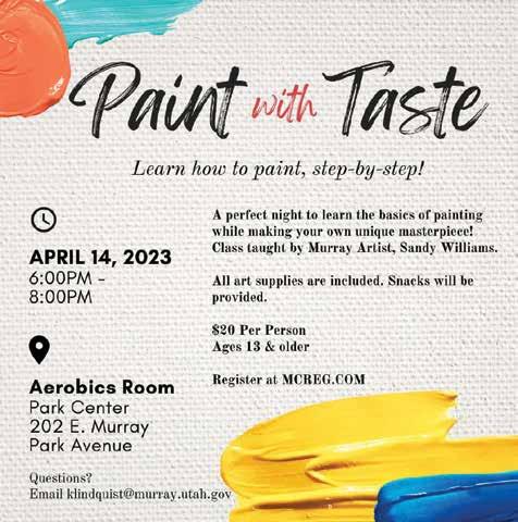 M urray C ity J ournal Page 30 | M ar C h 2023 • All types of arts & crafts accepted • 3x3 tables start at $40, 10x10 booths at $120 • Price includes help loading in and out Send your name/email for more information & application to bstockdale@msn.com or text 801-554-8170 by March 20th to reserve space. Sponsored by Friends of Millcreek Senior Center Vendors Needed! Spring Boutique at Millcreek Saturday, April 15th 9 a.m. to 3 p.m. 2266 E Evergreen Ave Millcreek, Ut UmpiresofUtah.com Adult Slow-Pitch Softball $24 Per 1 Hour Game For More Information or To Apply Please Visit: • No Experience Needed / We Will Train You • 4 Games/Hours Per Night / 3-4 Days Per Week • Uniform & Insurance Included With Registration • Salt Lake & Davis Counties • Training Starts March 14th • Season Starts April 3rd • No Weekends www.letsreadfunbooks.com Educational, interactive and fun From activity books, to neat fiction series, to internet-linked science and history encyclopedias Buy Books and More NOW Contact Independent Consultant: Lauren Casper @ letsreadfunbooks.com 20% OFF TWO ENTREES Lunch only (11am-4pm). Dine in only. Coupon must be present. Expires 4/15/23 (801) 944 0505 • 3176 East 6200 South Cottonwood Heights, UT 84121