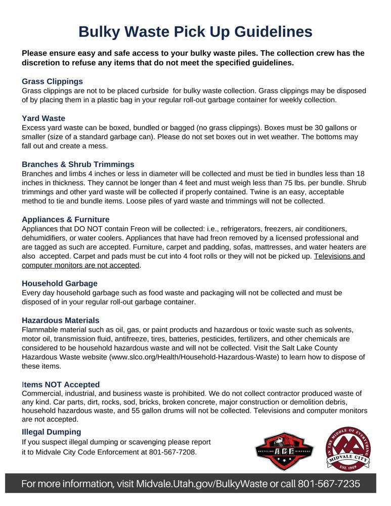 For more information, visit Midvale.Utah.gov/BulkyWaste or call 801-567-7235