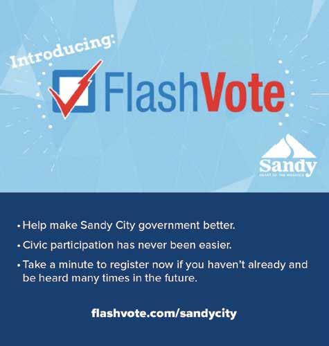 If you have not already done so, please consider signing up for our new survey platform, FlashVote. Your responses will help us make data-driven decisions on important city issues. You can sign up now at flashvote.com/sandycity or call (775) 235-2240 to participate by phone or text.