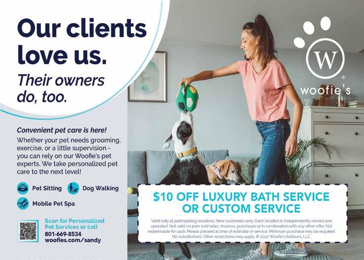 Join Woo e’s Sandy at its GRAND OPENING at Dockdogs Scheels Hunting Expo, Scheels Sporting Goods Store, in Sandy on Friday, 8/18 from noon to 6 p.m. and Saturday, 8/19 from 10 a.m. to 5 p.m. for dog nail trims, grooming, ra es, more! Visit www.woo es.com/sandy
