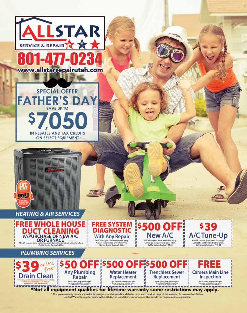 For Advertising Information Please Call 801-901-7963 or visit www.ValuePagesUtah.com 33 Blue Best HVAC women owned and operated local company! 801-341-9974 • BLUEBEST.COM Certified Lennox Premier Dealer Blue Best is Obsessed with cool dads! And Dad won’t Sweat the Price: a New AC is as low as $59/month! Make Dad Proud! Los Viernes Hacemos Estimados en Español Over 1,600 5-Star Reviews! REPLACE A FULL SYSTEM FOR AS LOW AS $8,495! Must present coupon at time of service. Expires 7/15/24. $6,000 in Rebates and Federal Tax Credits on a new system* Must present offer at time of service. *25-C tax credit, expires 7/15/24. $50 OFF Plumbing Repairs or Drain Ceaning! Must present offer at time of service. *25-C tax credit, expires 7/15/24. up to