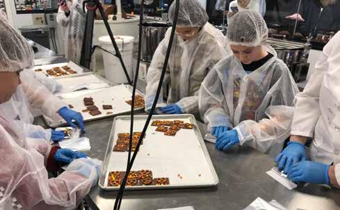 “We put on hair nets and paper scrubs over our shoes and went behind the glass where we saw the roasting and de-shelling of the cacao beans. They already had my chocolate premade with the potato chips mixed in, so we got to do the next step of filling the mold with the chocolate and put it in this machine that vibrated the bubbles out. Then, we put the toppings on — a pretzel and a tiny scoop of Reese’s Pieces — and set them in the fridge for 30 minutes. We wrapped them and that had to be done fast because they melt in your hand. Then, we put the label and the sticker on to take home,” Sienna said.