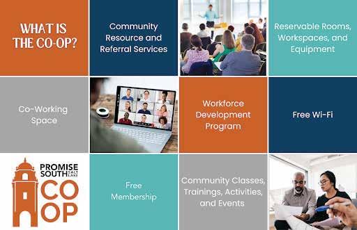 Inside the South Salt Lake Community Center, the Promise SSL Co-Op offers co-working space that is the perfect place to connect, work, learn, and grow. We provide resources for digital inclusion, financial empowerment, career & business advancement, and community resource and referral services. It is free and open to all Salt Lake County residents.