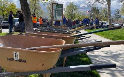 Right: American Express volunteers fill up wheelbarrows of mulch for tree planting on Arbor Day at Fitts Park. (Bill Hardesty/City Journals)