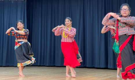 Aruna, Jenisha, Januska, Bhagya, and Sarika dance to the song titled “Guransh Fulda Banai Ramailo” at the Nepali-Bhutanese New Year Celebration at the Columbus Center on April 16. (Bill Hardesty/City Journals)