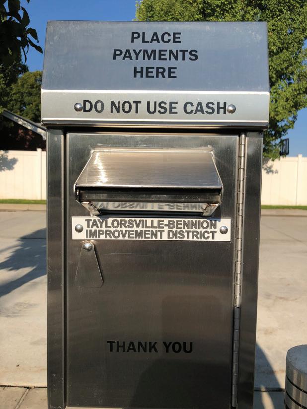 By Mail — Mail check or money order to Taylorsville-Bennion Improvement District, P.O. Box 18579, 1800 West 4700 South, Taylorsville, UT 84118-8579. A return envelope is provided with your bill. Just add the stamp, include your payment and drop it in the mail.