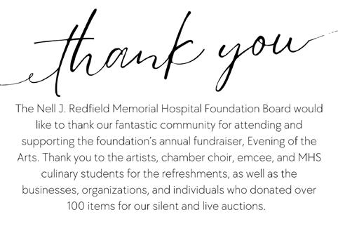 needed equipment and ongoing renovation of patient rooms in the local Hospital. The Evening of the Arts is the major fund raiser sponsored by the Nell J. Redfield Memorial Hospital Foundation, and the community was out in force in support. Silent auction tables buzzed all night long until the final bell, and after placing a bid the only option was to get back in line to make a new bid, since the first one would almost always have been beaten by the time you made it around again.