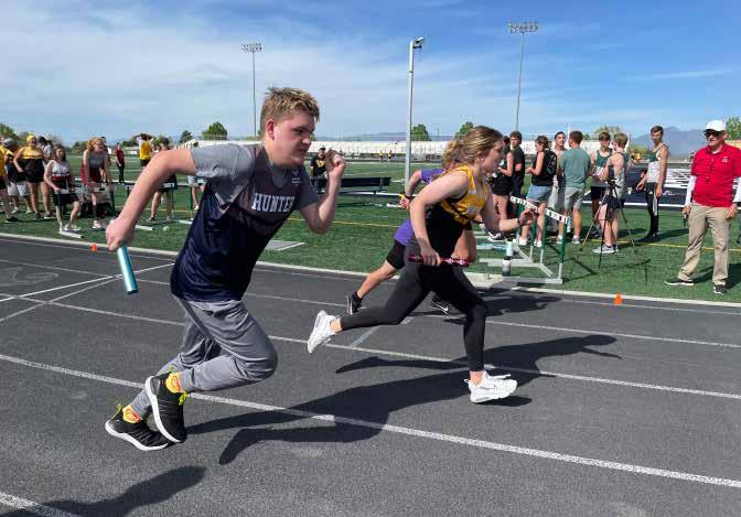 Hunter High’s unified track athlete starts the 4x400 relay at the state unified track meet. (Julie Slama/City Journals)