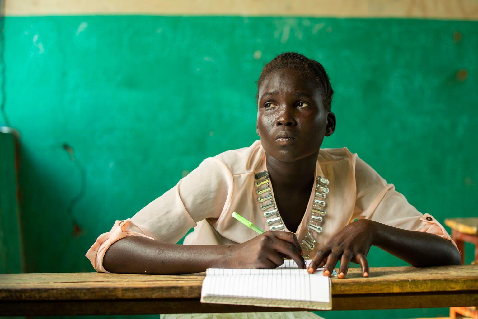 En la oto ra ía, Nyedien Reath Bidon , una re u iada de 16 añosdeSudándelSur,estáenunauladeséptimo radoenla Escuela Primaria y Secundaria de Makot, en 2013. Lleva ropa tradicional y escribe en su cuaderno. El otó ra o la captó mirando al costado, resaltando sus expresiones aciales: nerviosaydecidida.Nyedien sueñaconserin eniera.
