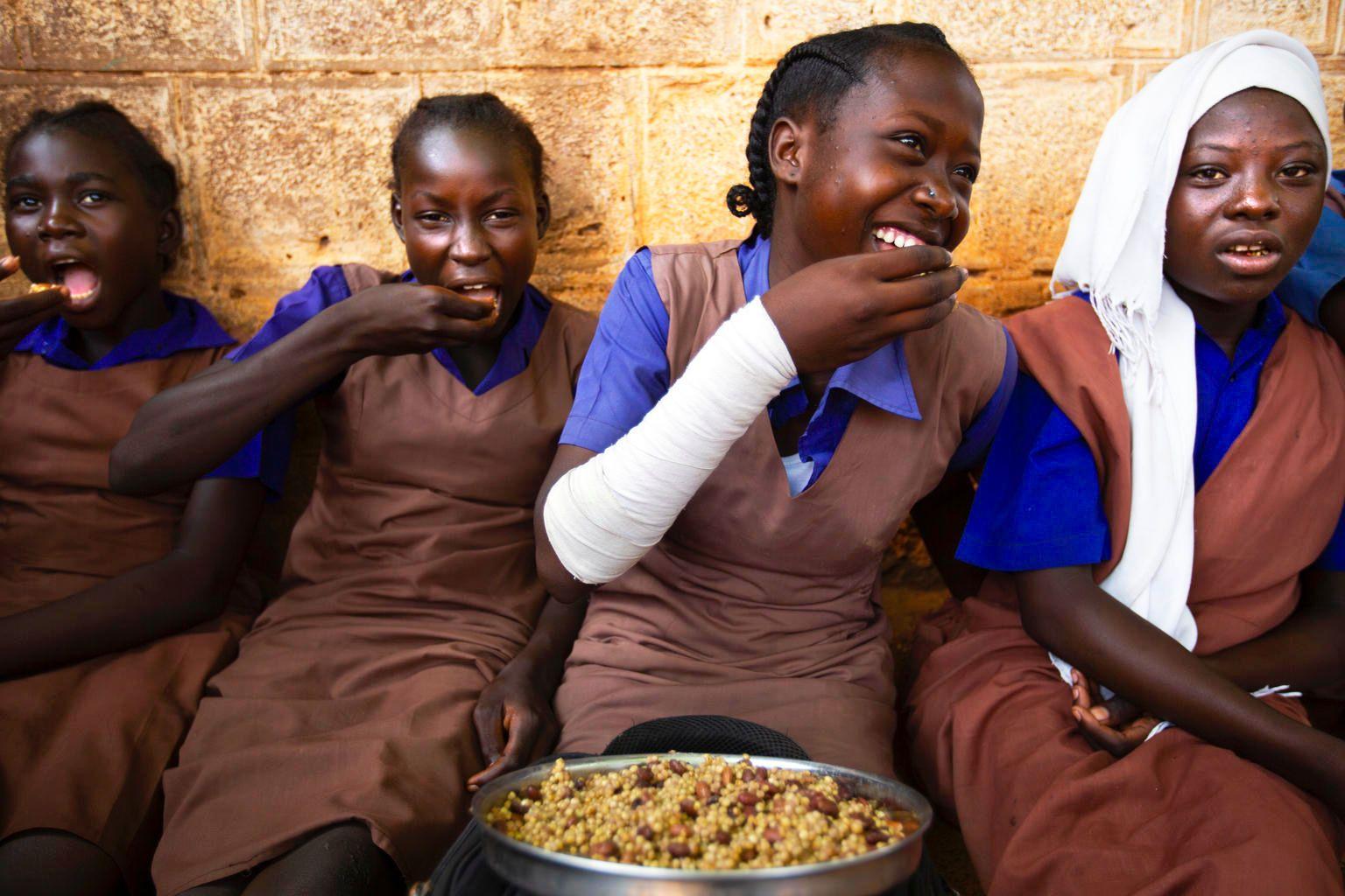 Si observamos con atención esta oto raía podemos ver a cuatro estudiantes que toman sualmuerzoenlaescuelaprimariadeniñasen Wau. Podemos ver sus caras de elicidad y que están disrutando de su almuerzo. Las estudiantesllevanununiormecolorazulycaé yunadeellastieneunvelocolorblanco.