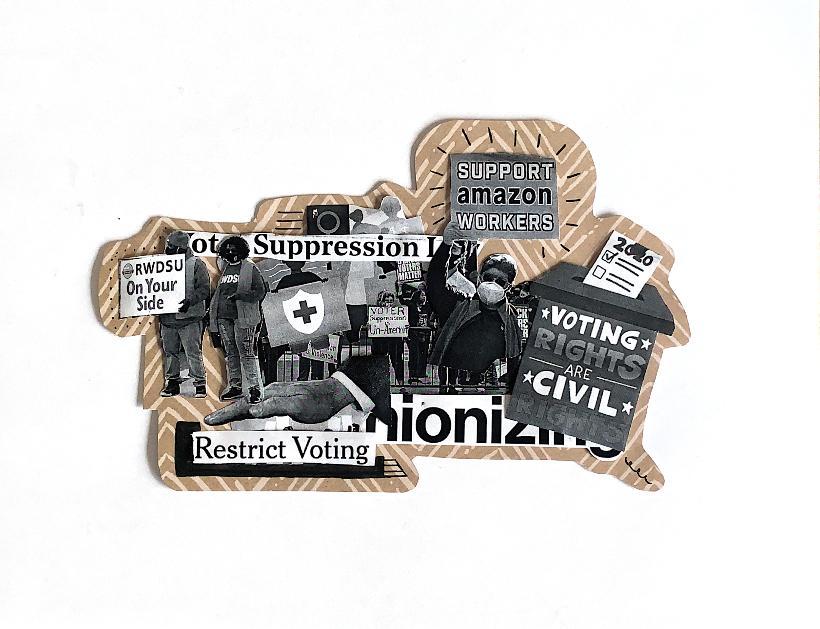 Además, el colla e representa la ur encia del derecho al trabajo, con las rases “Voter Suppression”, “Unionizin ” y “Restrict Votin ”. Las rases expresan la importancia del derecho al trabajo y también, el derecho al trabajo en buenas condiciones.