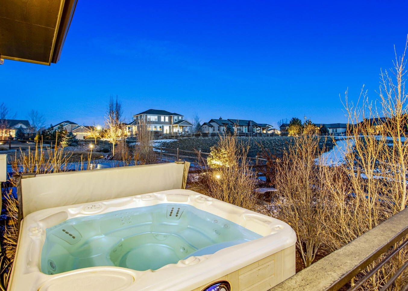 • Huge covered back patio with iron railing, Trex decking, gas plumbing for BBQ, 2-way gas fireplace, dimmer switch and Rocky Mountain views