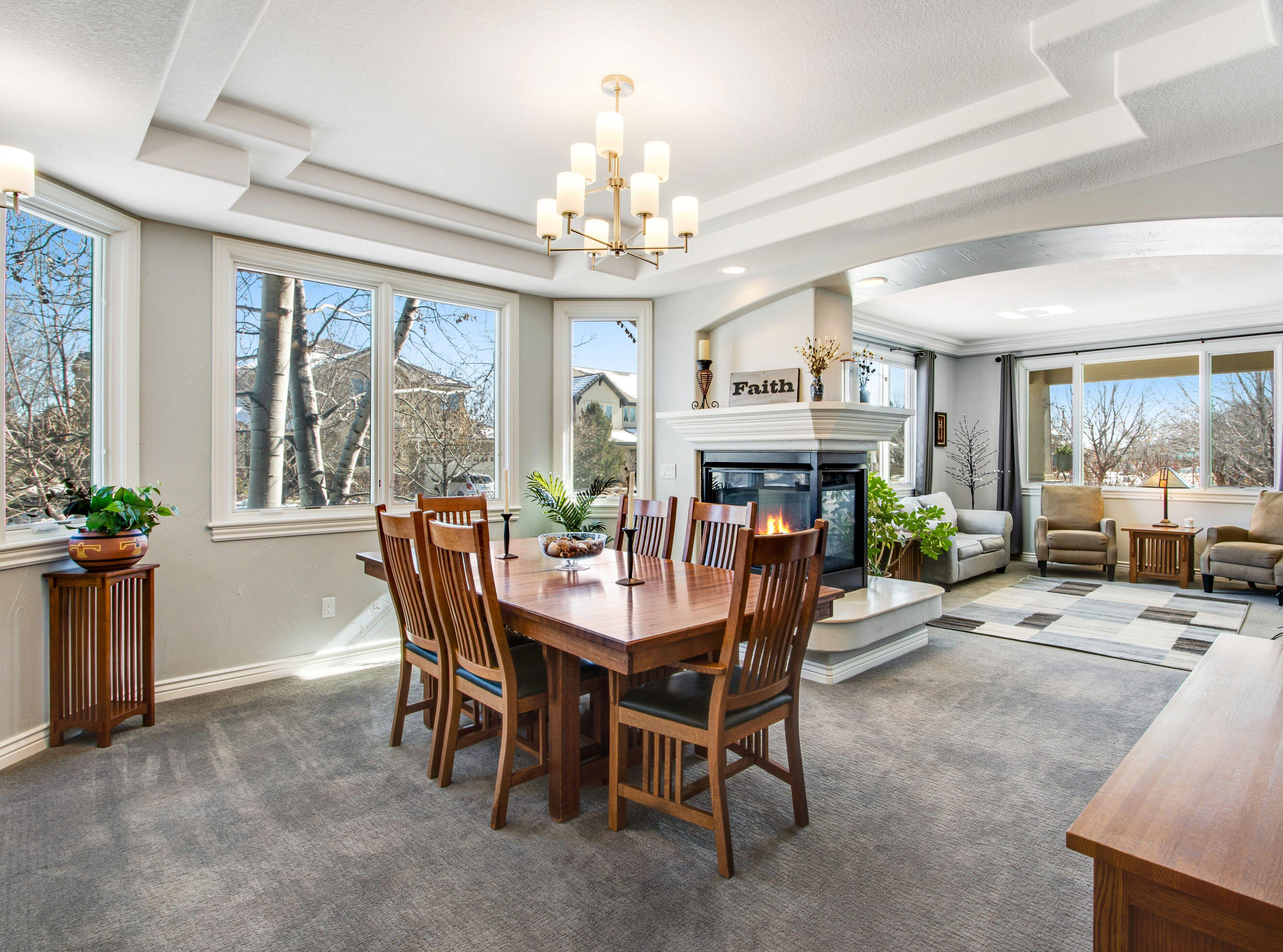 • Family room features a tray ceiling with fan, gas fireplace and a custom mantle