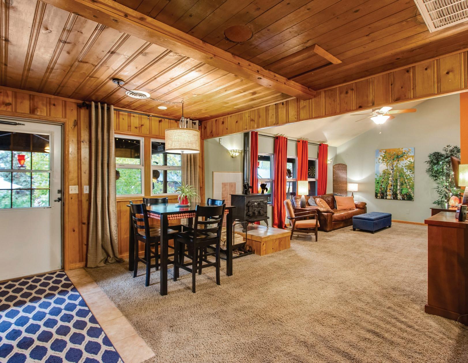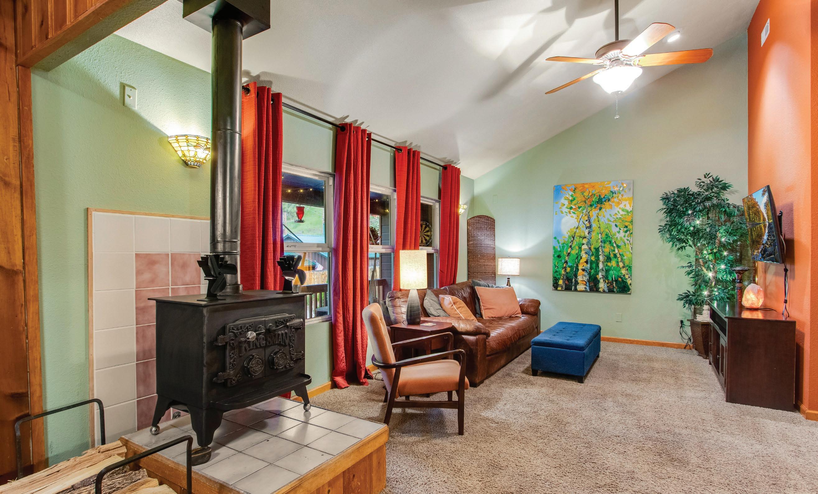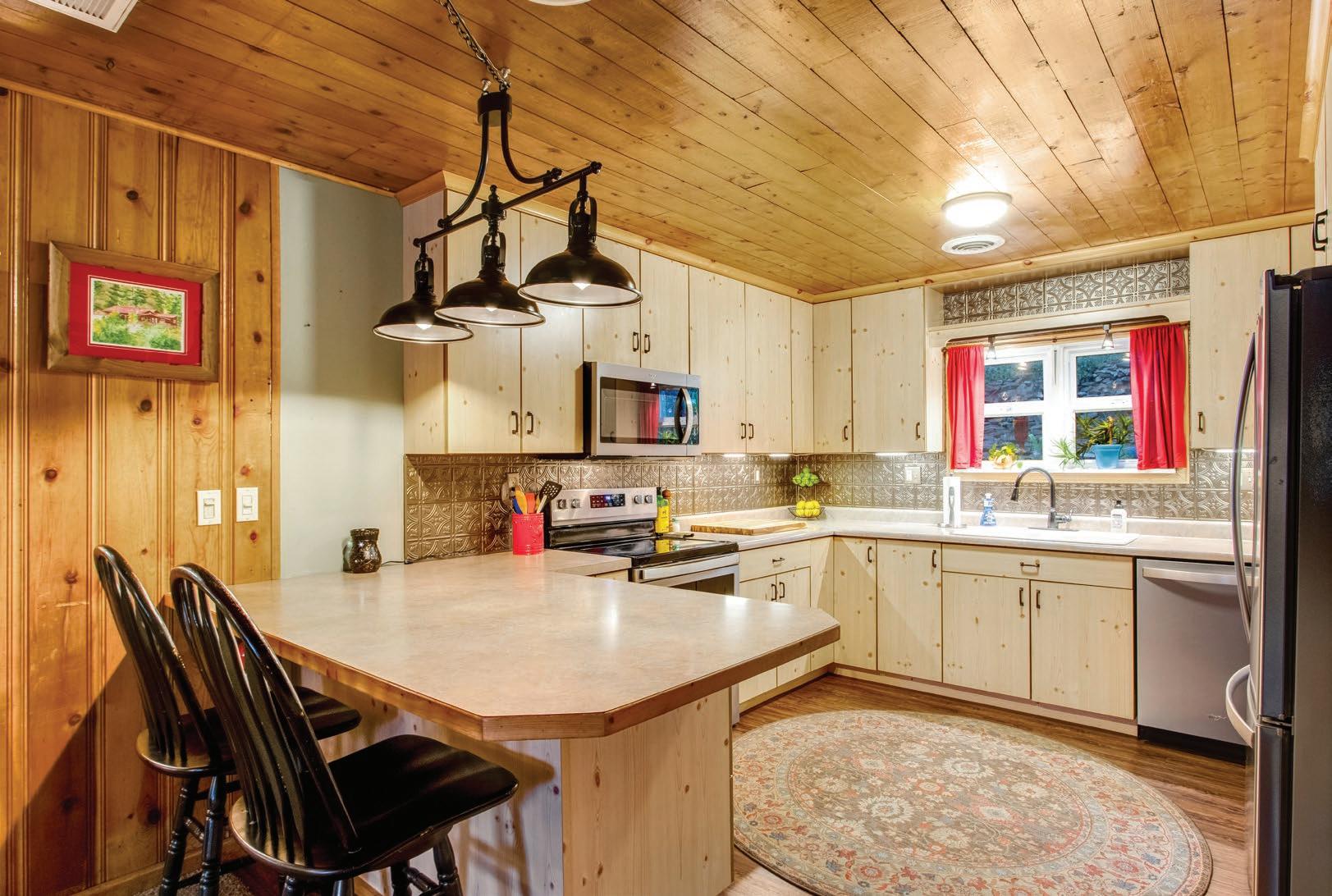 • Cozy kitchen features plenty of solid pine cabinets with hardware, undermount lighting and crown molding, plus plenty of counter space with full decorative backsplash, breakfast bar and stainless-steel appliances which are all included