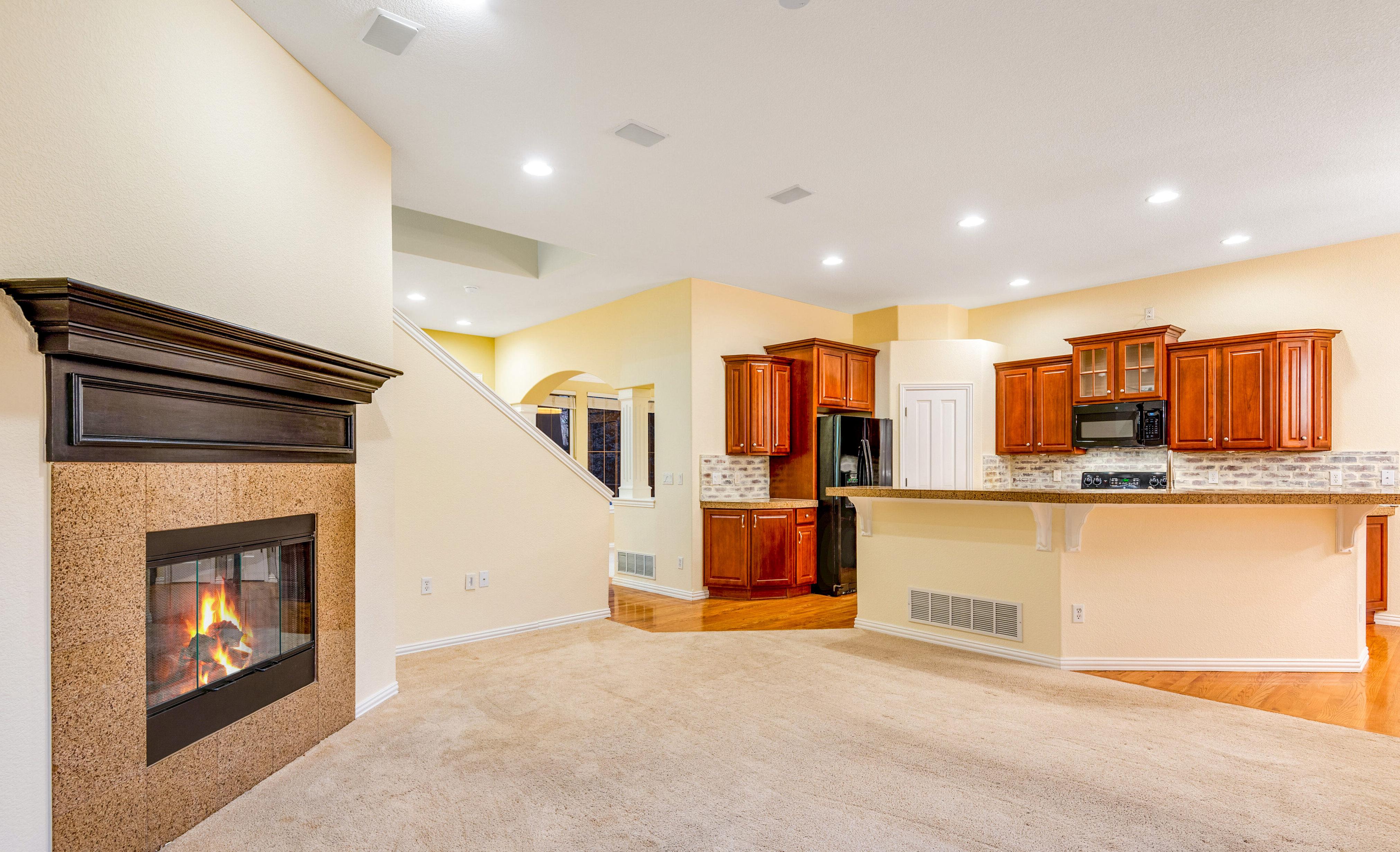 • Family room features plenty of light plus a corner gas fireplace with mantle along with pre-wiring for a ceiling fan and surround sound