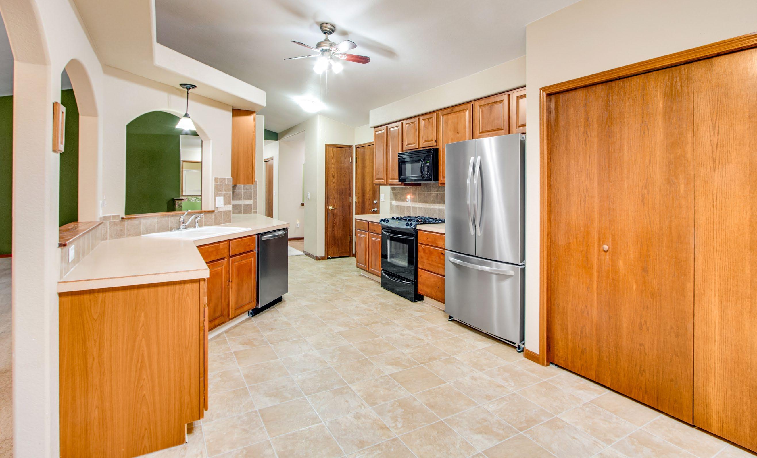 • Kitchen features plenty of counter space and knotty alder cabinets, under mount lighting, double pantry and a full tile backsplash, gas range and all appliances are included