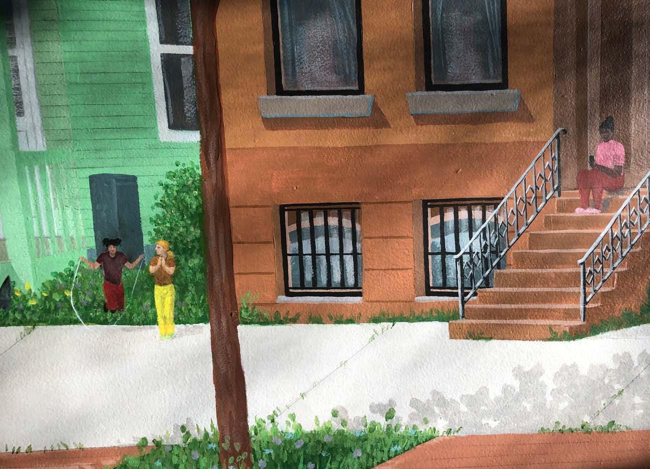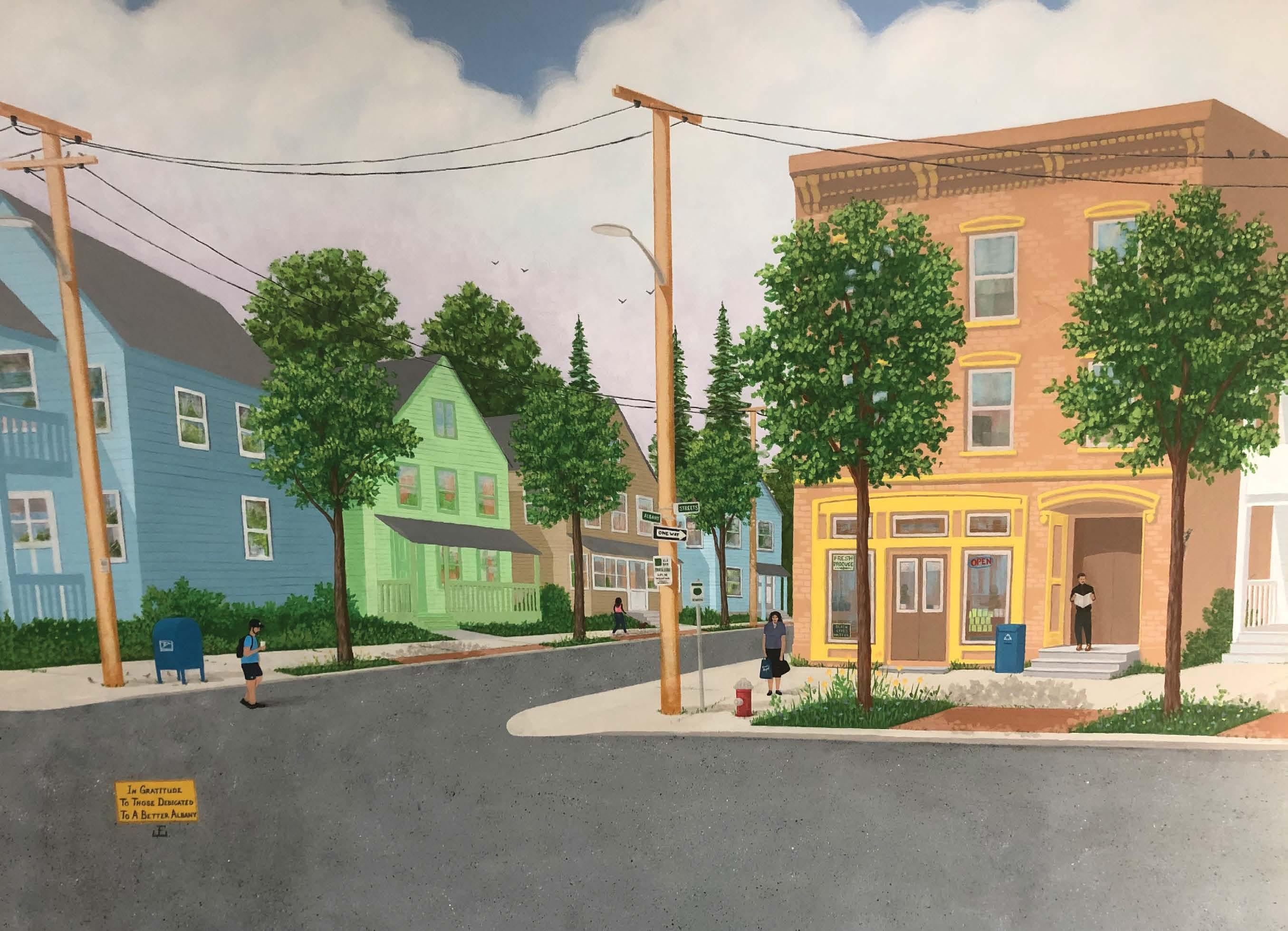 Jeff Emery has created an Albany cityscape mural in the lobby of the 255 Orange St. as a gift for the Community Loan Fund and Albany Center for Economic Success. “I wanted to do the mural as a way of giving back,” Emery says. Emery’s mural, a blend of local neighborhoods, took six months to complete.