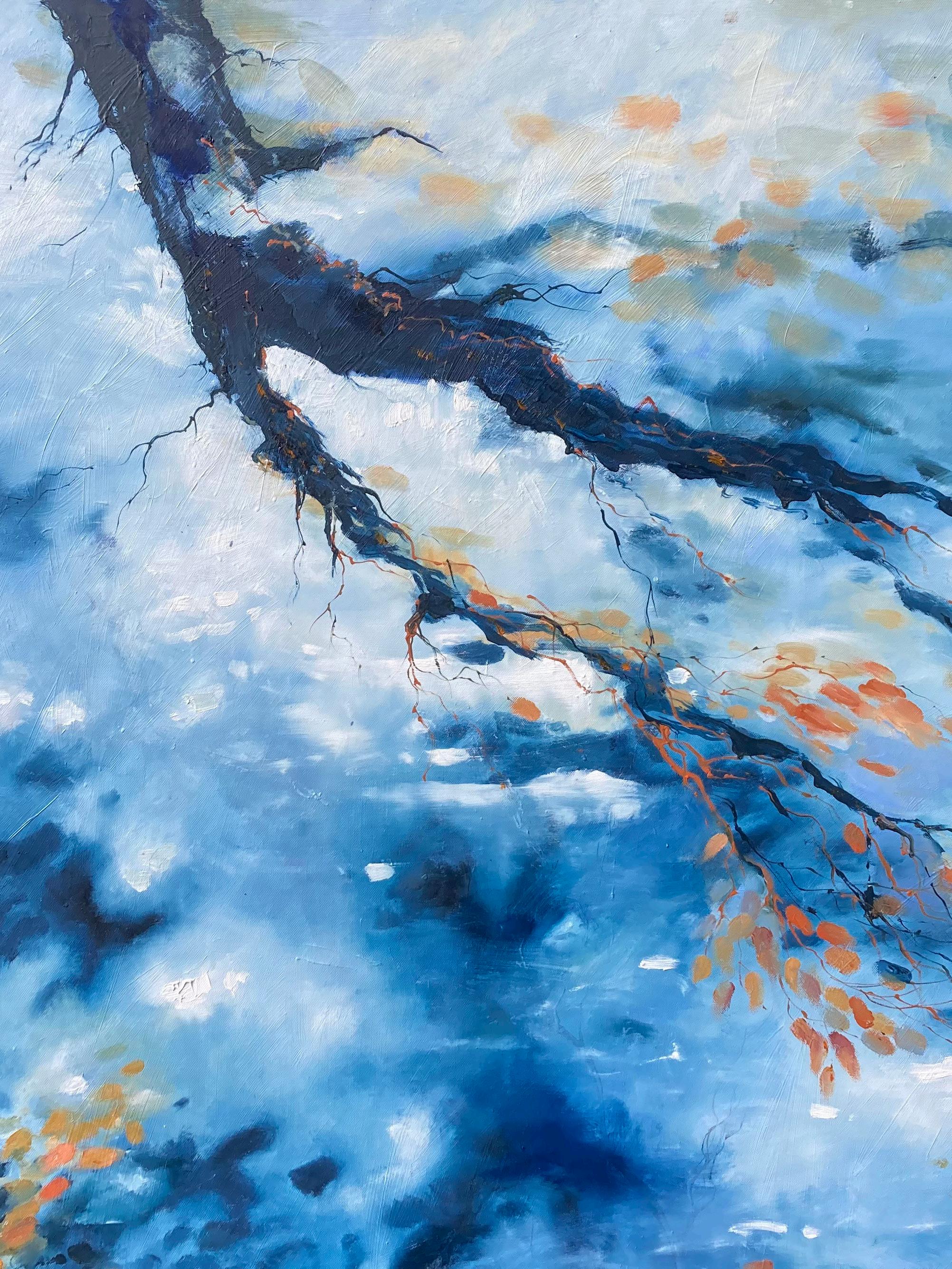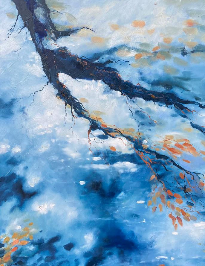 What's the inspiration / story associated with the artwork? This painting was inspired by my wildlife pond at the bottom of my garden. I was clearing leaves in Autumn, looking at the reflected sky and the overhanging branch of the magnolia and thinking about the cycle of the seasons and of life, the magnolia had been glorious in spring , now it would sleep to reawaken.