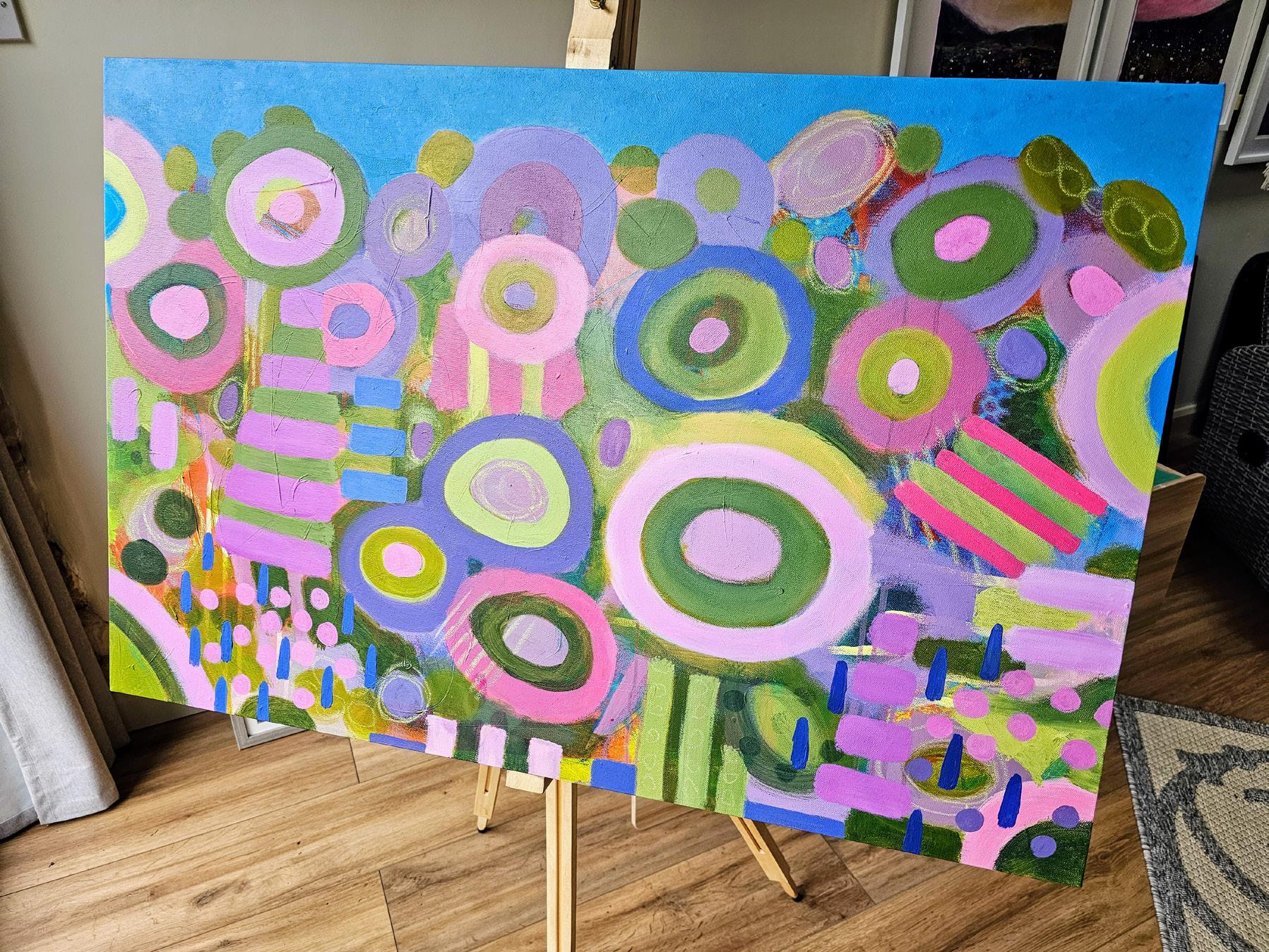 What's the inspiration / story associated with the artwork? It's hot outside and the hydrangea, roses and hollyhocks are all fighting for attention. I say get a chair and a glass of Pimms and enjoy them all while they last (and before it starts raining again!). Enjoy every petal and every sip! This painting is made on canvas with acrylic and oil pastels. There are lots of layers in this painting adding texture and interest and many hidden details to be found.