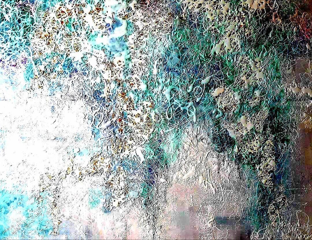 I love to start a canvas with random marks using oil pastels, charcoal or water-soluble crayons. I then add acrylic paint using scrapers and other tools to give random effects and start to create interest. I like to hide things in the painting such as tiny pencil drawings or shapes made by scratching into paint. I build up layers with paint and marks until I know what the painting is going to look like. Sometimes I have a loose idea when I start but other times it’s a complete unknown. I let my intuition guide me and find this much more freeing than trying to copy a photograph. I don’t copy reality; I create my own.