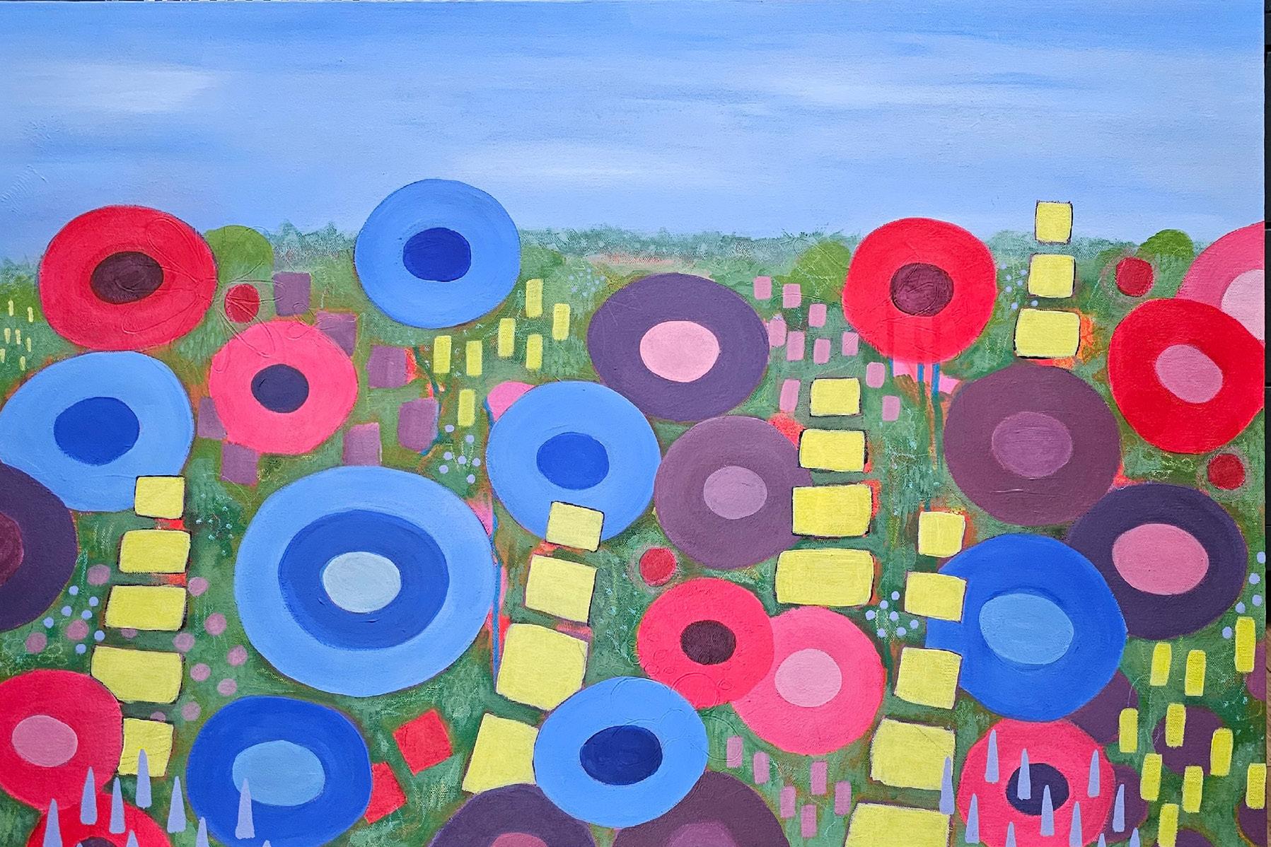 I have always been creative but have only recently found my love of acrylic paint and mixed media art. I work in a studio space in the garden and love being inspired by nature. In particular I love bright and bold colours that I see in my flower borders, and I feel inspired every time I walk around the garden. Flowers, leaves and shapes can be found all year round so I am never short of ideas. I love to represent flowers with simplified shapes as that is how I see them. Nature provides the palette and the ideas, and I apply to the canvas.