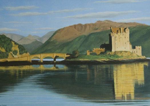 One of the largest paintings I’ve ever completed. By sheer good luck we visited the castle late one May afternoon when the setting sun painted the castle walls with golden light that you only seem to get in Scotland at that time of year. I ended up standing knee deep in the loch to get the view and reflection in the water I wanted in my photos, before completing the painting on my return home. I fully expected the water reflections to be difficult to paint only to be very surprised when they just ‘flowed off my brush’.