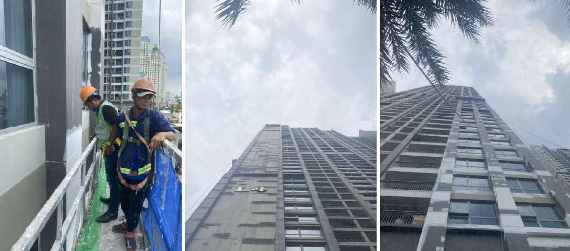 tác đu dây xử lý chống thấm tường ngoài căn hộ