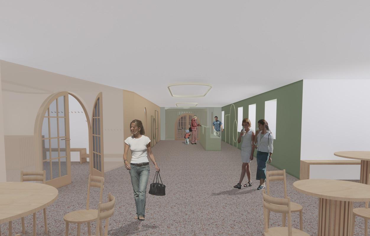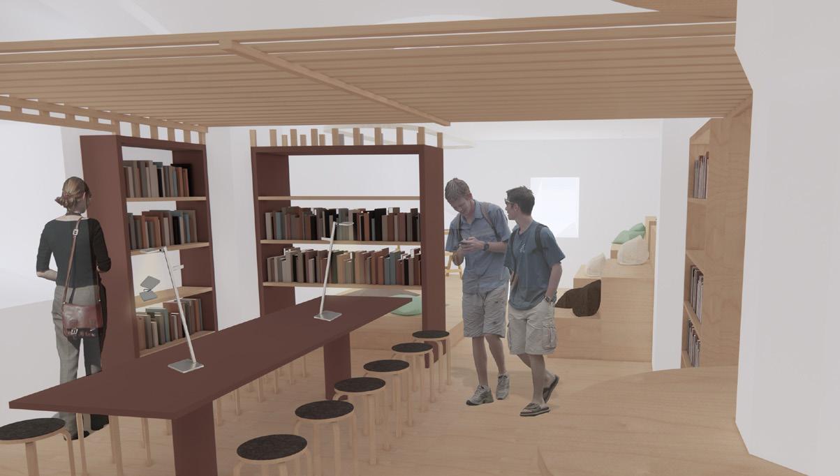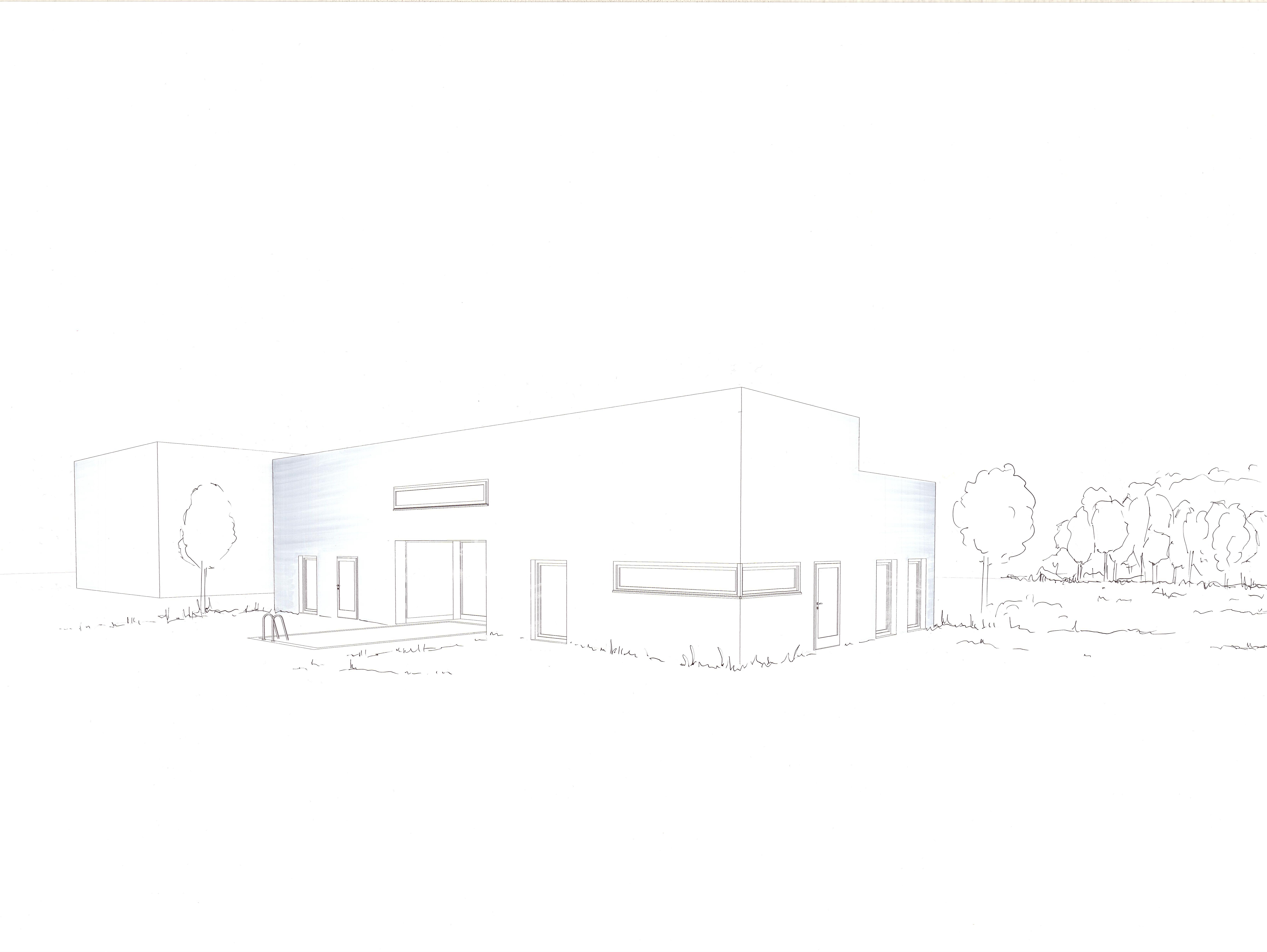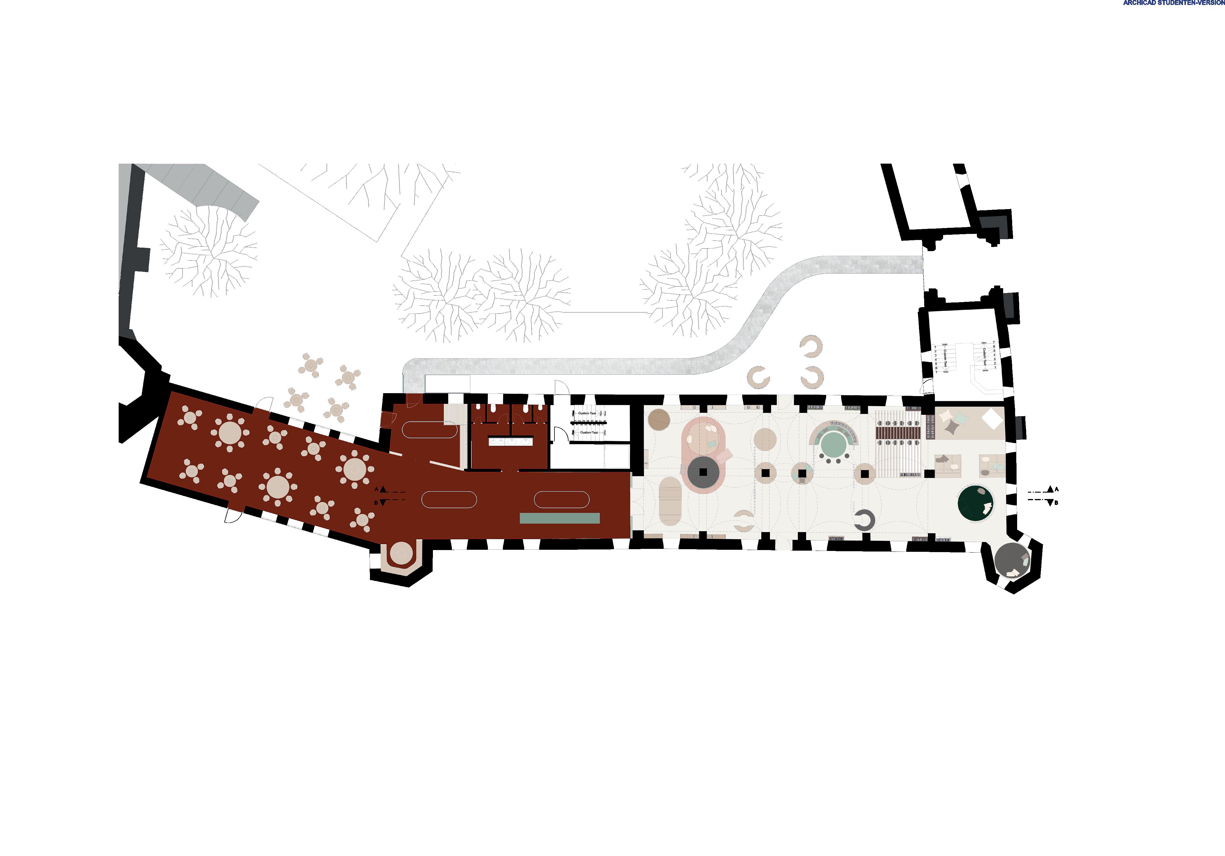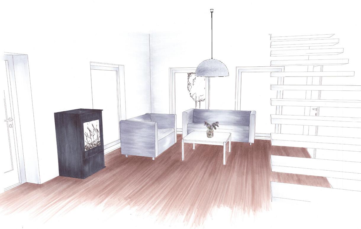 Das von Lena-Marie Schuh und mir entworfene Gästehaus ist eine 200m² große, symetrisch aufgebaute Wohnung. Im Nor den befinden sich die Schlafzimmer, beide jeweils mit einem begehbarem Schrank und privatem Bad. Zusätzlich befindet sich im Flur ein Gäste WC und ein kleiner offener Raum. Diese Bereiche haben eine Raumhöhe von 2,50m. Der südliche Teil des Wonraums hat eine Deckenhöhe von 5,40m. Hier befinden sich Wohnzimmer, Küche und Terasse mit einem Swimming-Pool. Circa ein Viertel des Pools schnei det in die Wohnfläche ein, wodurch eine Überdachung des Schwimmbereichs ermöglicht wird. Im Innenbereich kann diese Einragung als Galerie benutzt werden. Eine weitere Be sonderheit ist das große Fenster zwischen dem Wohn- und Essbereich wodruch viel Tageslicht in die Wohnung gelangt und zusätzlich ein toller Ausblick in die Natur ermöglicht wird. Durch die unterschiedlichen Dachhöhen des Gasthauses ent steht im nördlichen Teil eine große Dachterasse. Diese kann durch die Kragtreppen im Wohnzimmer betretet werden.