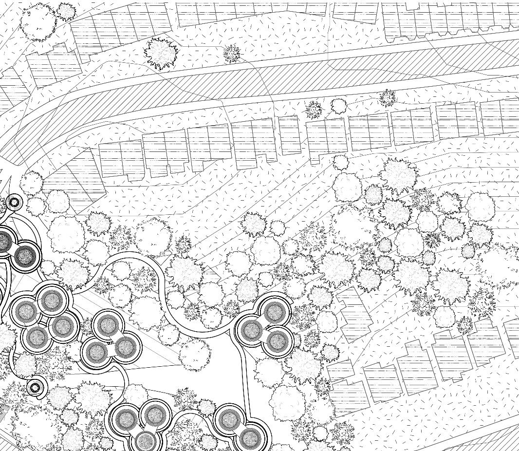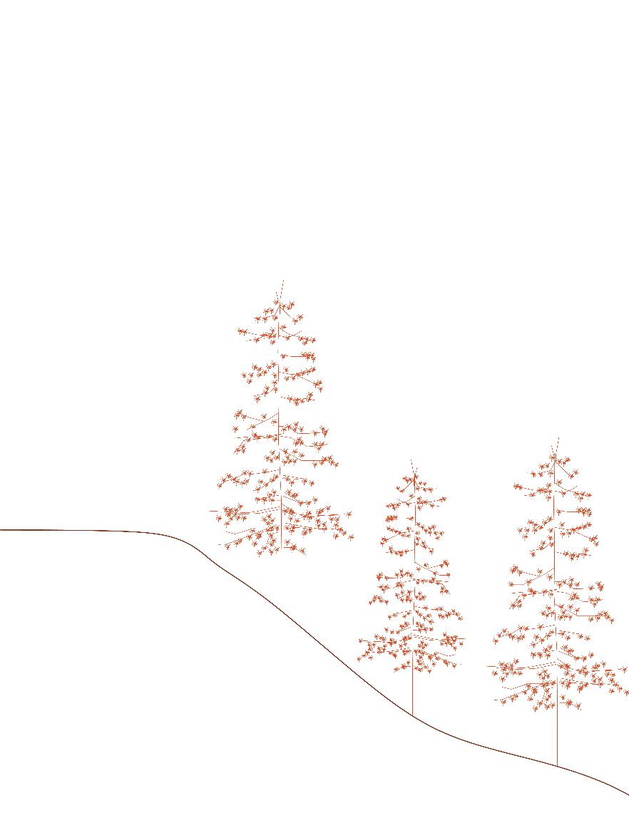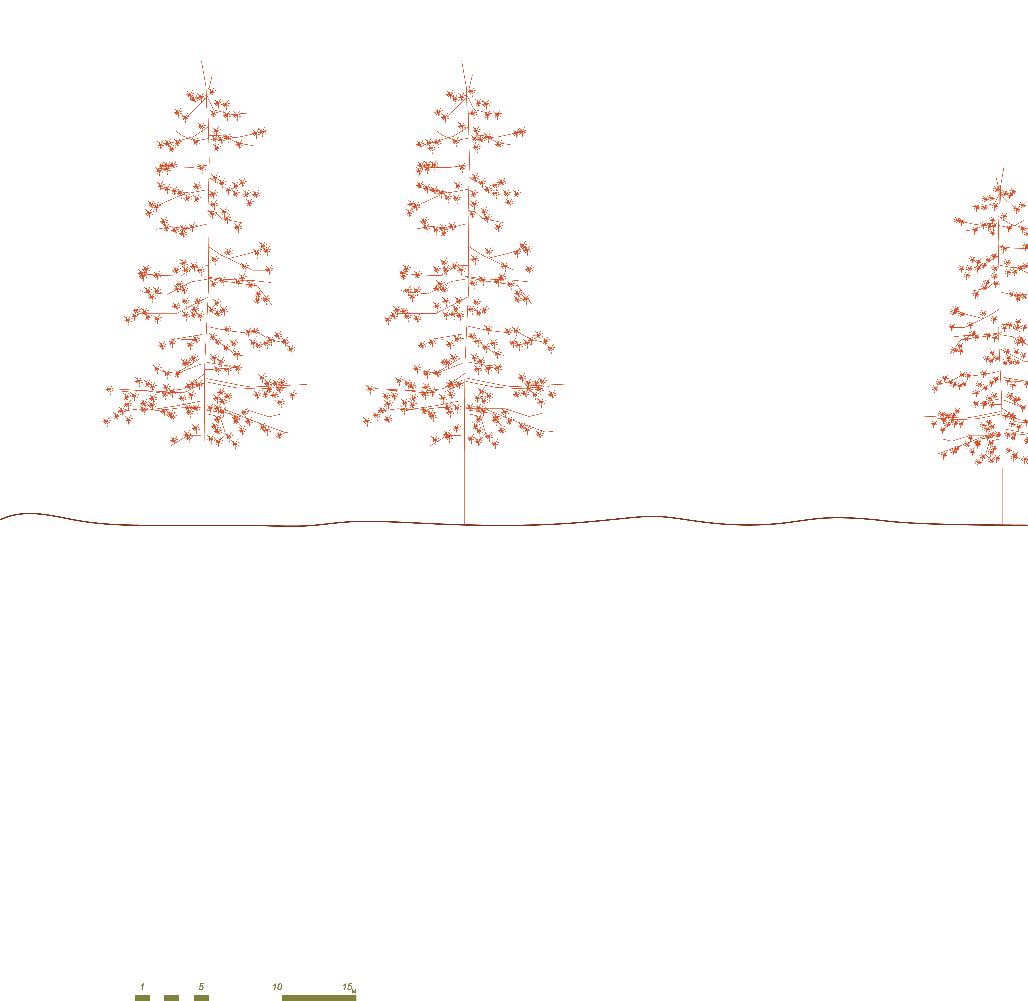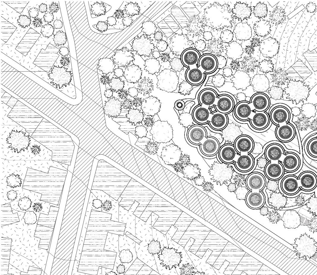 Clusters of modules are placed across the site according to existing sun conditions, with the tallest and highest density of modules in areas of max lighting. Clusters are accessed via two levels of service paths which are connected to the lower public pathway by vertical circulation cores. The treated wood of the public path and the steel grating of the service paths allows for circulation throughout the site to remain after the modules decay.